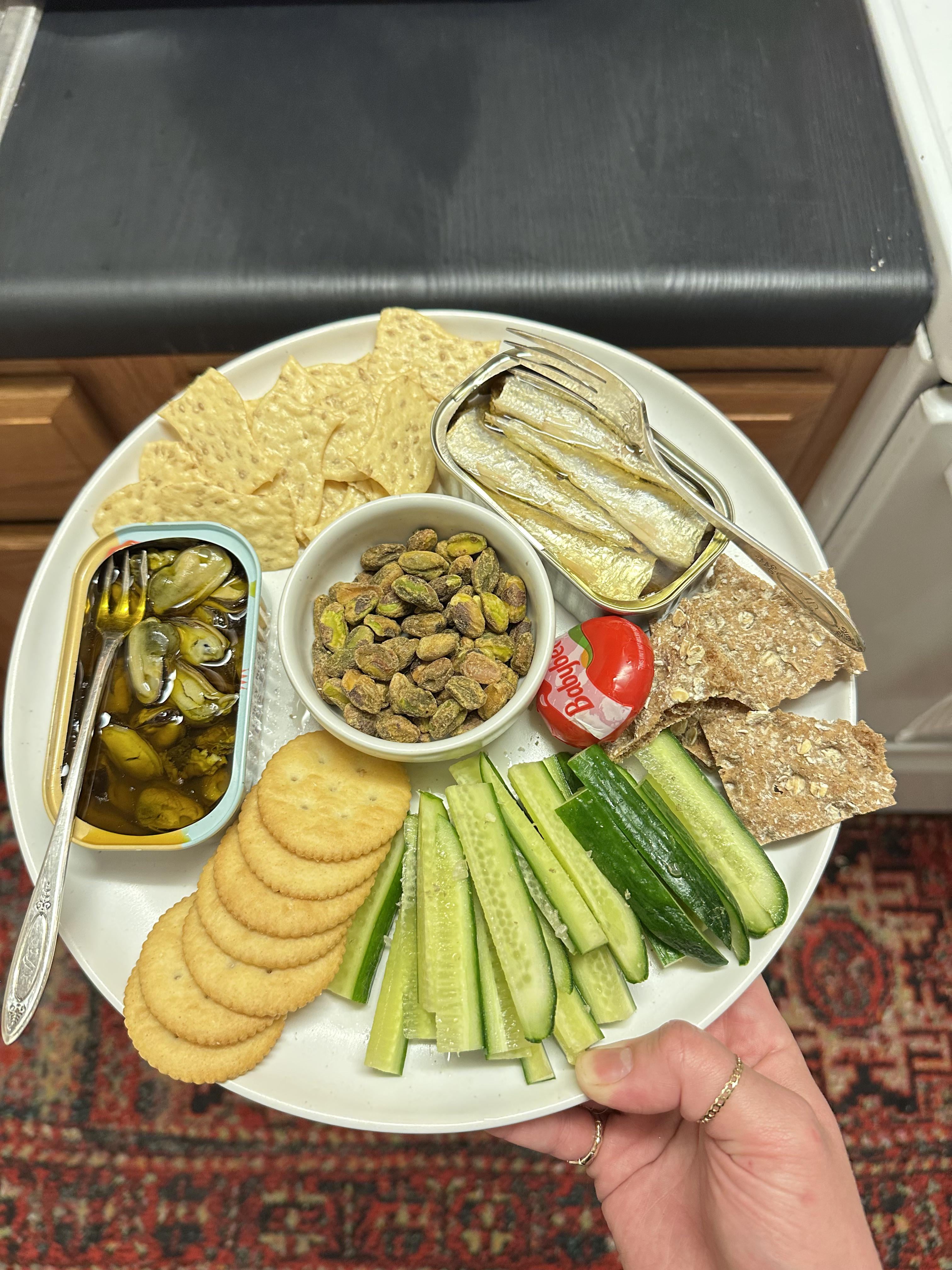 Tins here are Matiz Lightly Smoked Sardines and Trader Joe’s Lightly Smoked Mussels. Served with almond sesame crackers, Ritz, a broken up Wasa cracker, some salted pistachios, a Babybel and some cucumber with Maldon smoked salt.