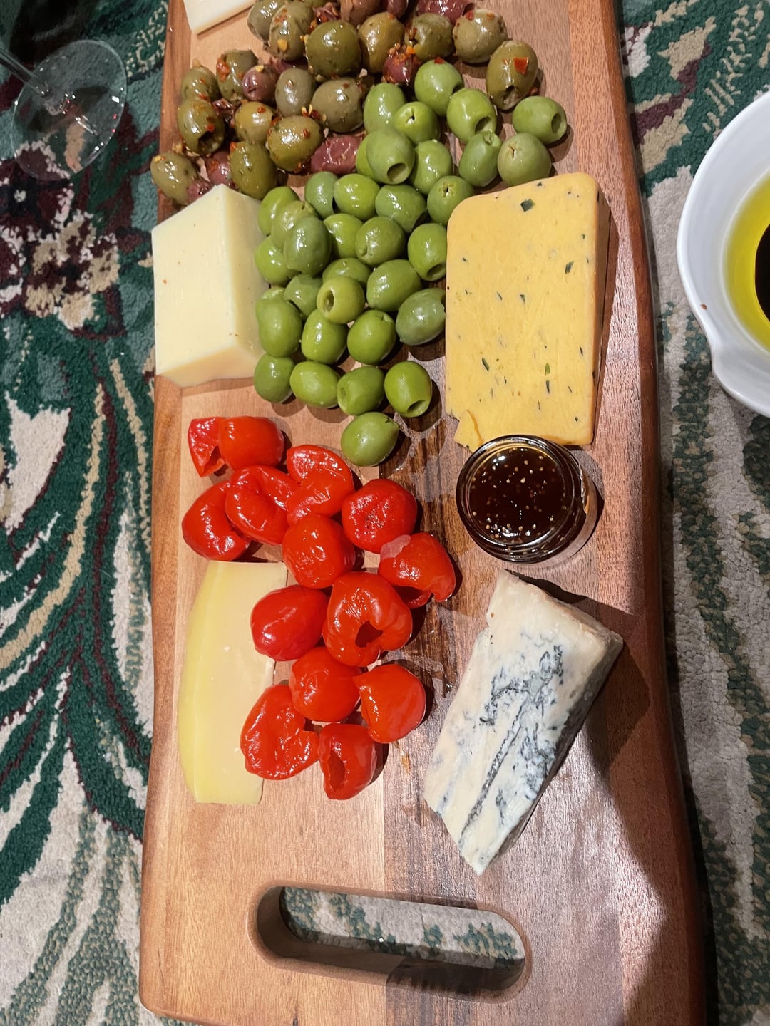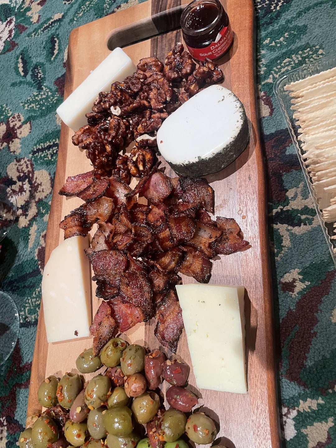 I work in the cheese department at Whole Foods and I decided to go all out tonight. Gorgonzola picante, Gruyère, double Gloucester w onions, midnight moon, manchego, goat cheddar and capricio de cabra w/ herbs. Olives, bacon, caramelized walnuts and 2 little jams