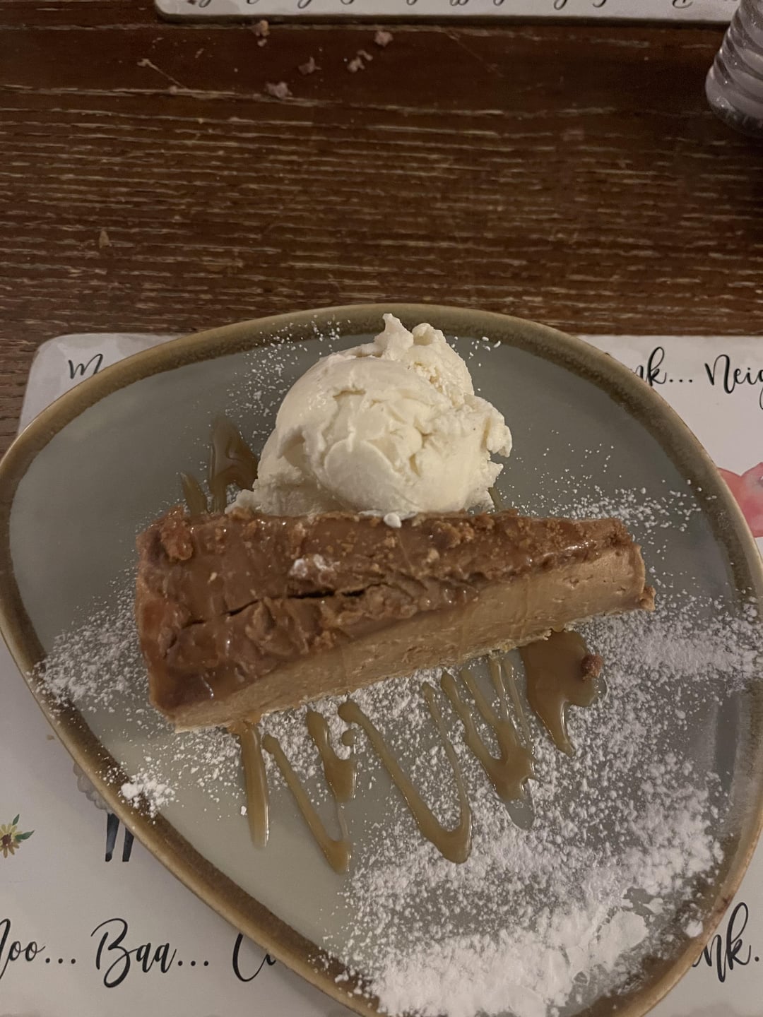 main- beer battered chicken goujons with fries and sweet chilli sauce (i left the salad) desert- biscoff cheesecake with ice cream !!