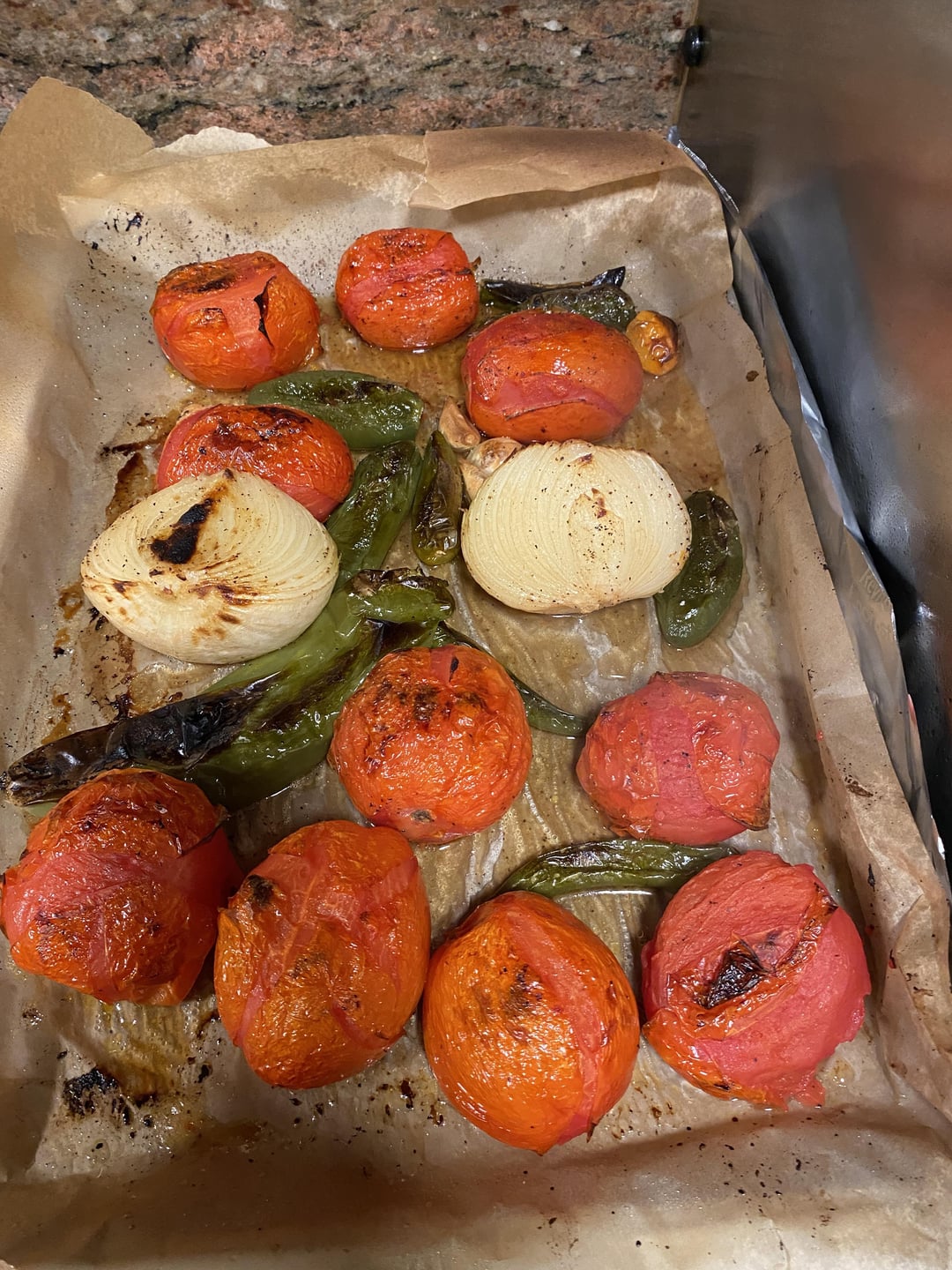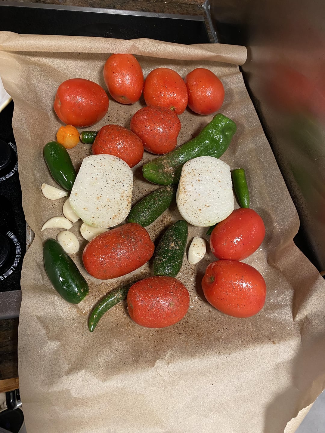 Ten Roma tomatoes, one large yellow onion, 6 cloves of garlic, 4 of both jalapeños and Serrano peppers, one Anaheim pepper and one habanero. Added salt, pepper, cumin, cilantro and lime after cooling.