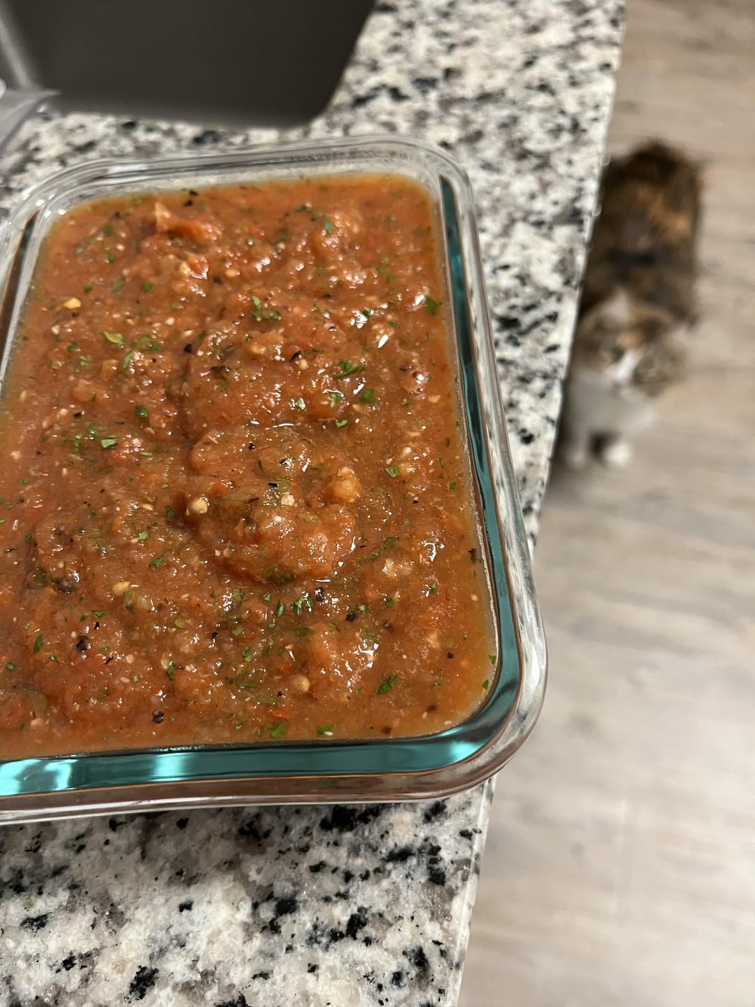 This was my second time ever making salsa and it turned out fantastic. I roasted 6 roma tomatoes, half an onion, 5 small garlic cloves, and one jalapeño for 20 mins at 400F, followed by a 5 minute broil (removed the garlic halfway through the broil, its juices were burning). Added a handful of cilantro, healthy pinch of salt, one lime, and 3 tabasco peppers.