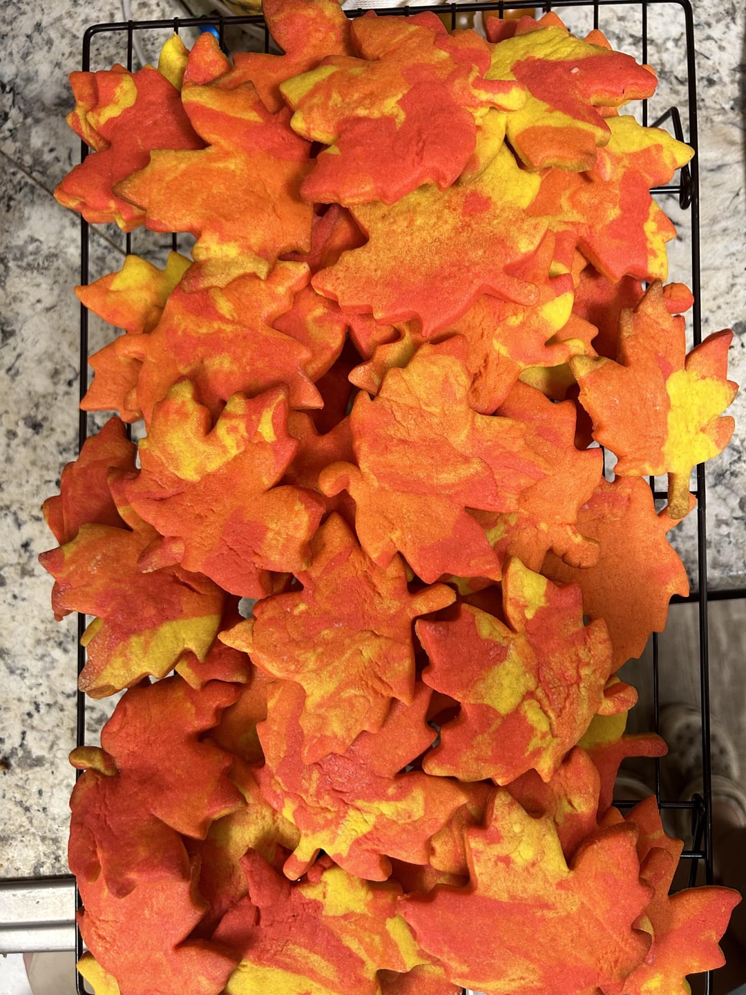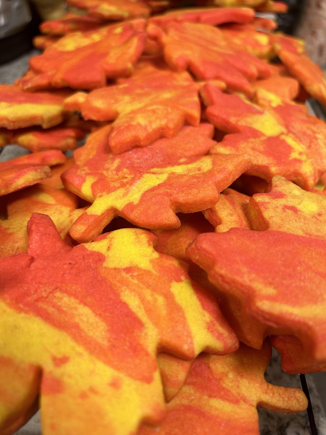D0gTh0t 1 year ago RECIPE:2 cups butter2 cups granulated sugar2 eggs1 tsp vanilla1 tsp maple extract1 tsp pure maple syrupRed and yellow color gelsCream butter and sugar. Add eggs. Add flavorings.Divide mixture into 3 parts. Color one third red, one yellow, and one red & yellow to make orange.Add 2 cups of flour to each part. Chill the dough for at least 4 hours or overnight.Tear off different colored pieces and mash together and blend with fingers to create marbled effect. Use desired cookie cutter.Bake at 350°F for 10 minutes. Cool and enjoy!Notes:I use several drops of color gel. Low and slow in the oven to maintain color!Use powdered sugar instead of flour when rolling out dough to avoid sticking and flour drying out the cookies.