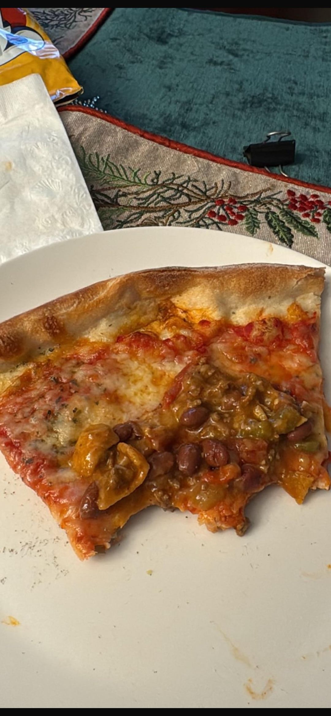 I think your nanny hates you. You guys stiffed her or did something. That’s a hate crime pizza. I’ve had chilli pizza. Would do it again
