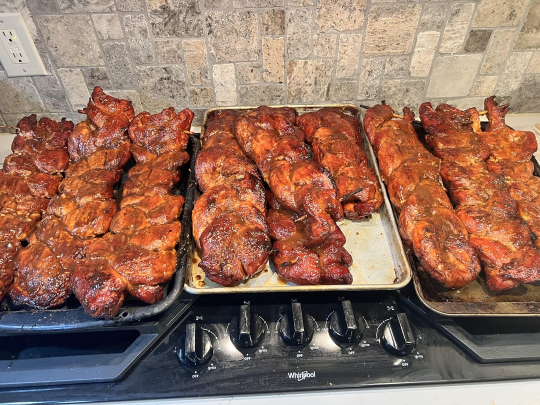 Rubbed with mustard as a binder and seasoned with Traeger pork and poultry, and at the end of the cook cycle, they were treated with Traeger apricot sauce, as well as Traeger cherry barbecue sauce after I ran out of the apricot. Lol. They turned out great!