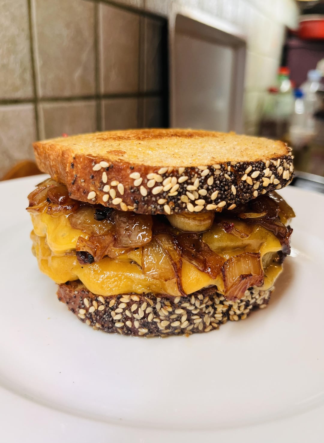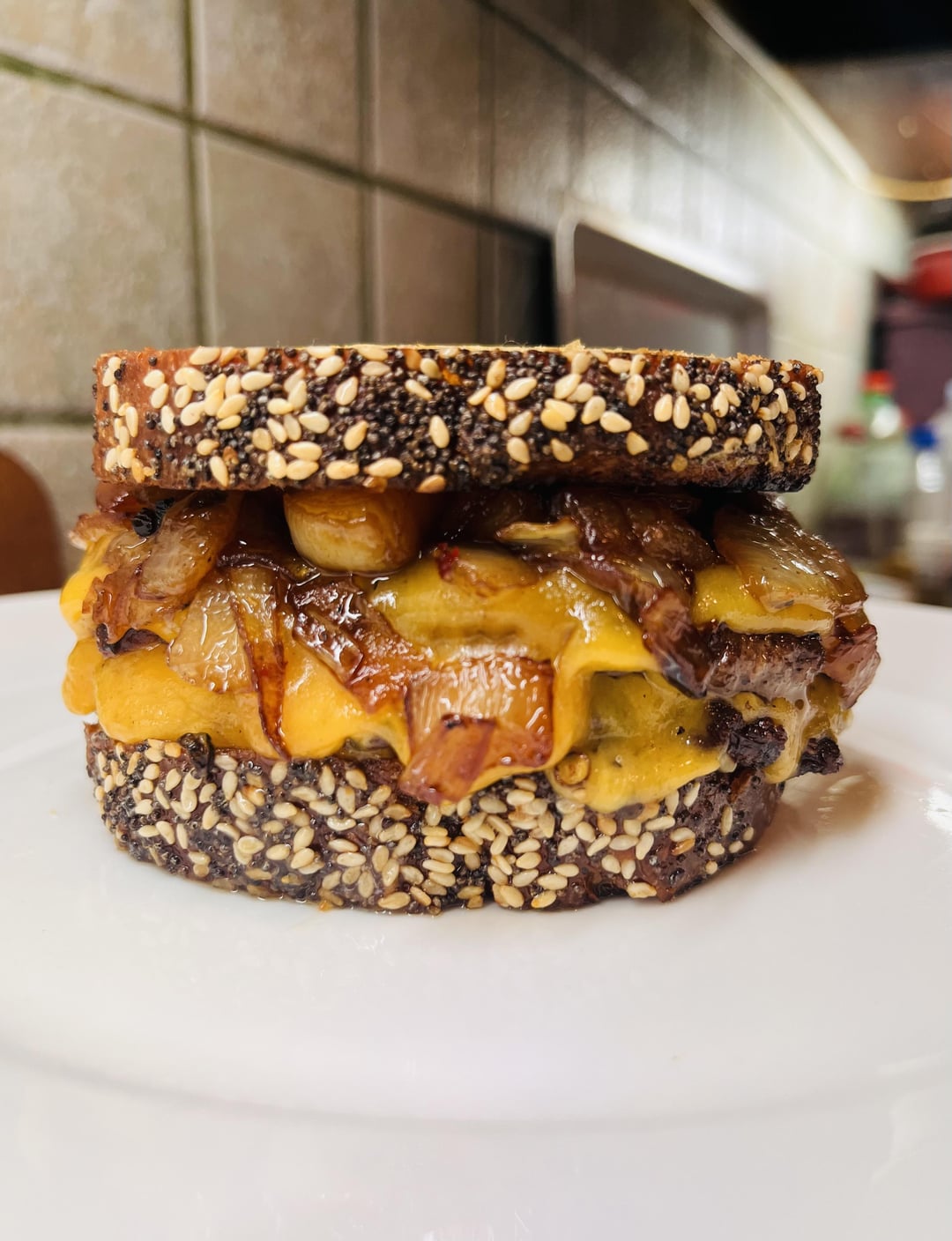It was a beef quarterpounder with melted cheddar cheese sauce, topped with chunky onions that were grilled and doused in teriyaki sauce. All served in a round wheat/rye bun.