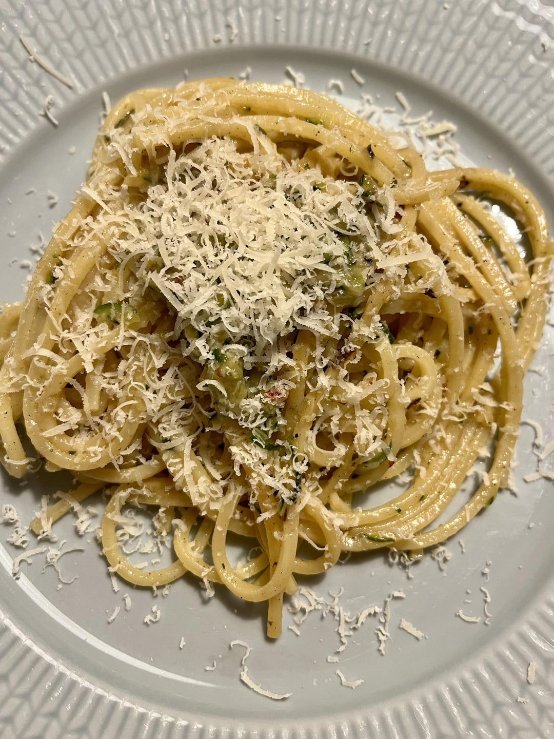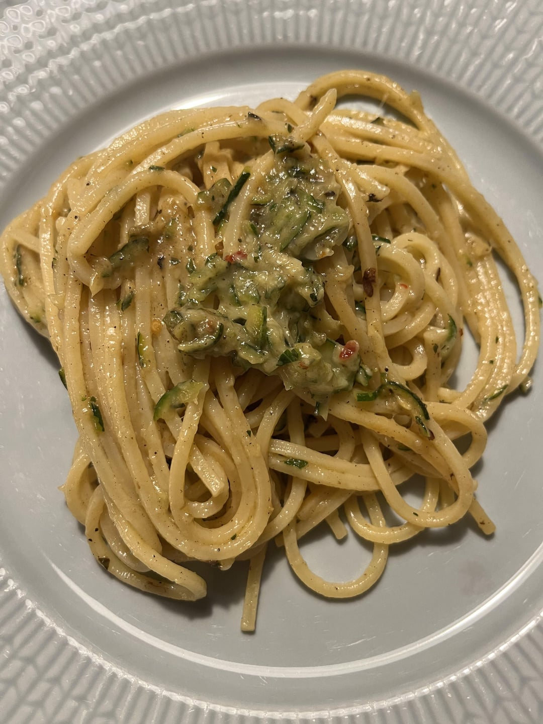 Fried zucchini,, chili flakes and basil. Lots of black pepper too. Simple but so good 🤌🏼