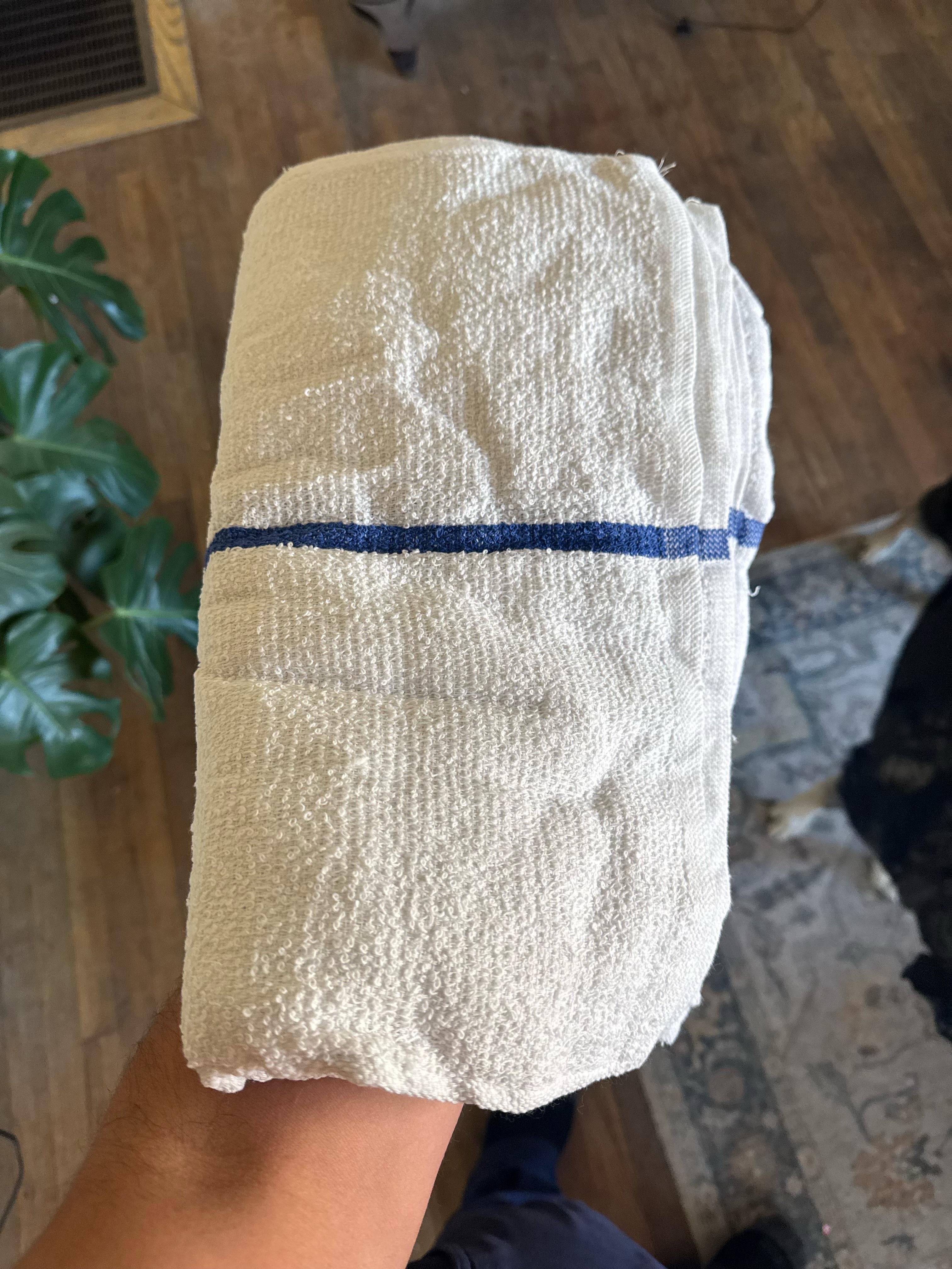 I was a chef for a big named band on tour. Travel kitchen, Sysco/gfs/us food deliveries everything except linen service. So when I was in between runs I would find a restaurant getting a delivery of linens and I would slide them 20$ for a slab of aprons and 2 packs of bar mops. I’d do it about once a month. They have extras on the trucks and when your nice to your delivery guy he will always hook up and pack in need