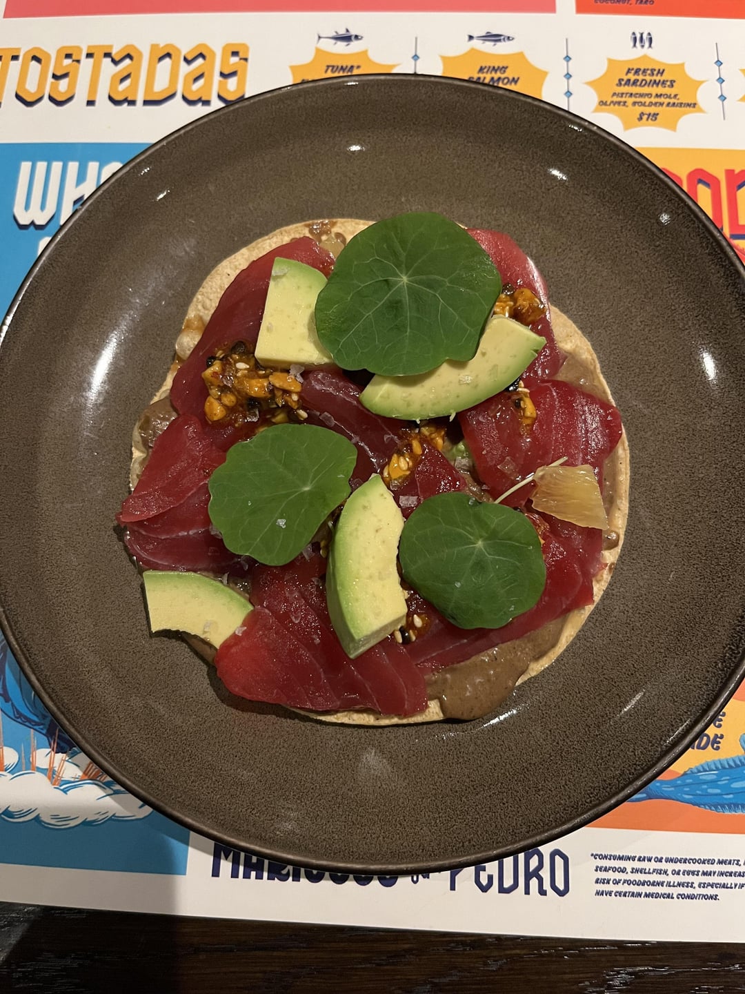 Tuna Tostada 11/10, Baja Fish Taco 8/10, Shrimp Gobernador Taco 10/10, Tinto de Verano 9/10, Flan 10/10 if you share it, but like 6/10 when you eat it all to yourself after these three dishes (it was very sweet)