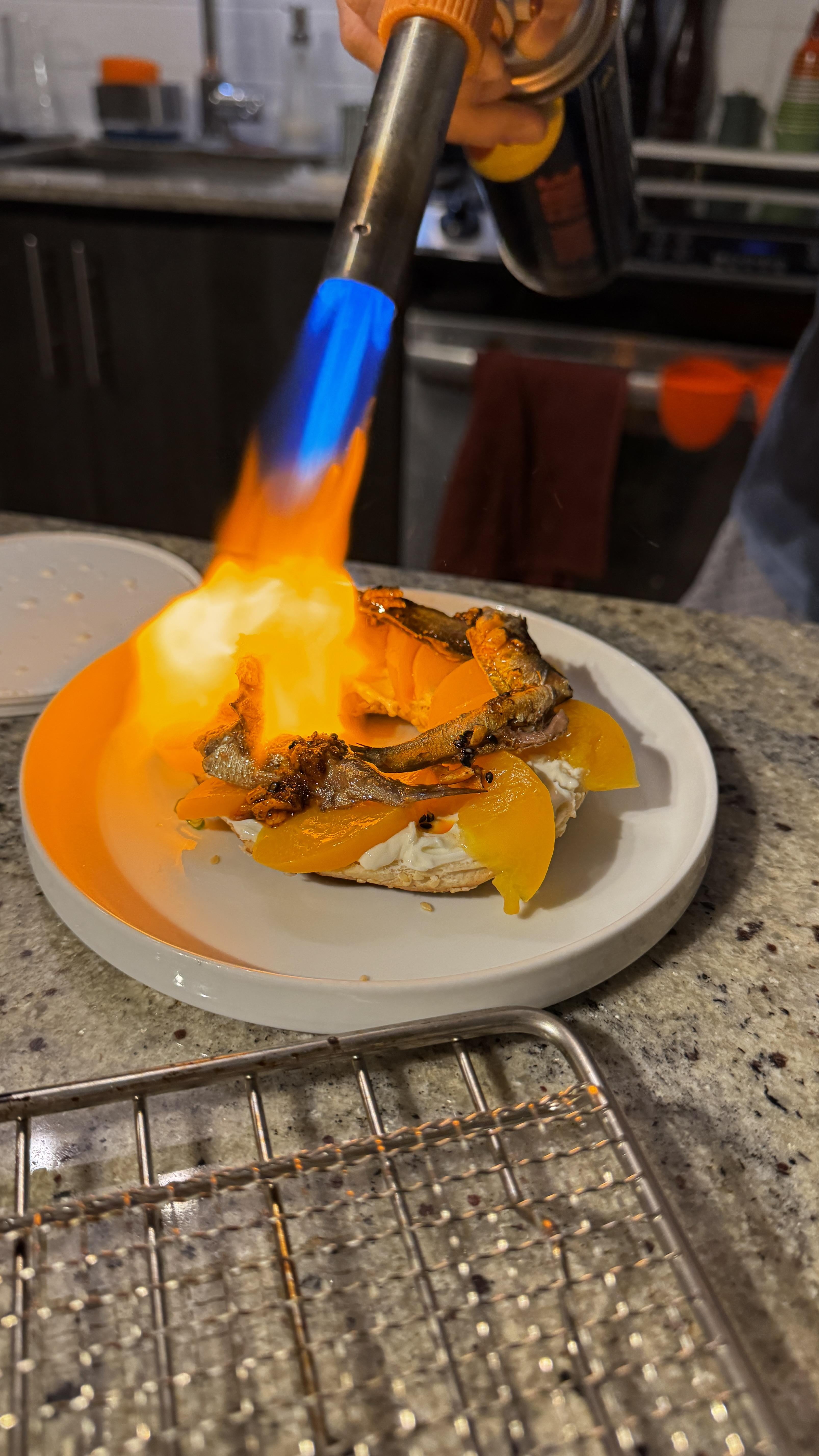 I put mine on Montreal bagel half with labneh (think peaches and cream), added chili oil, torched it, pickled banana peppers and sliced scallions.