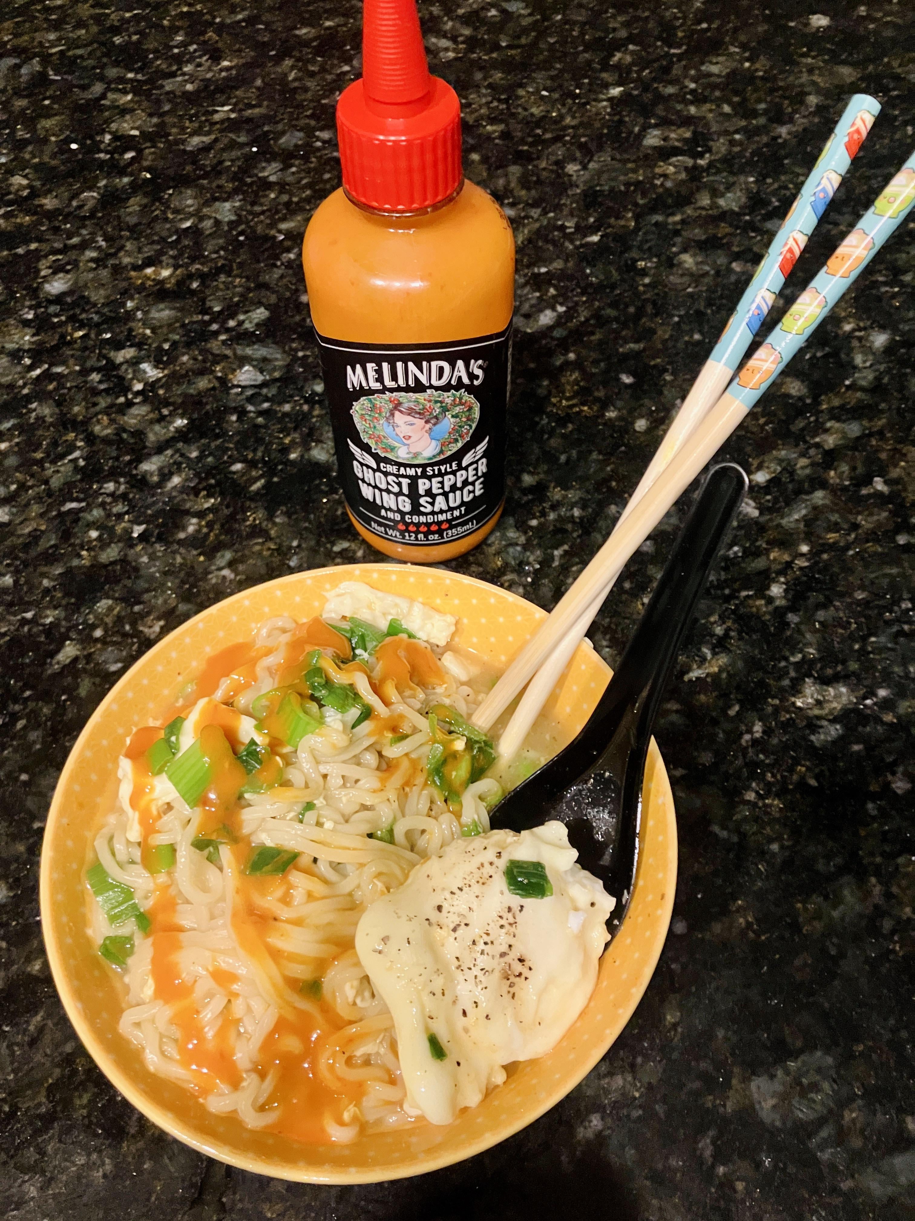Life is hard, albeit lovely. I hope you are all out there facing your challenges and meanwhile doing what you can to make things as easy on yourselves as possible. Some days, this presents itself in the form of meals. This one has: •Maruchan Ramen Noodle Soup, Chicken Flavor•Poached Eggs•Plenty of Scallions•Melinda’s Ghost Pepper Hot Wing Sauce