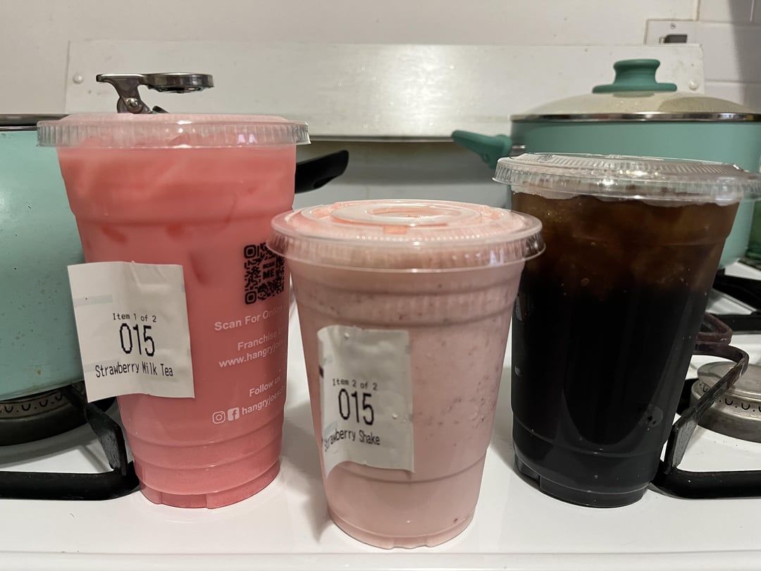 The first set of drinks is a strawberry milk tea, a strawberry milkshake (very watery, not like a typical thick shake), and a Dr. Pepper. These are from a local place. They have zero nutritional info for the drinks and they don’t list the ounces for the drinks either.