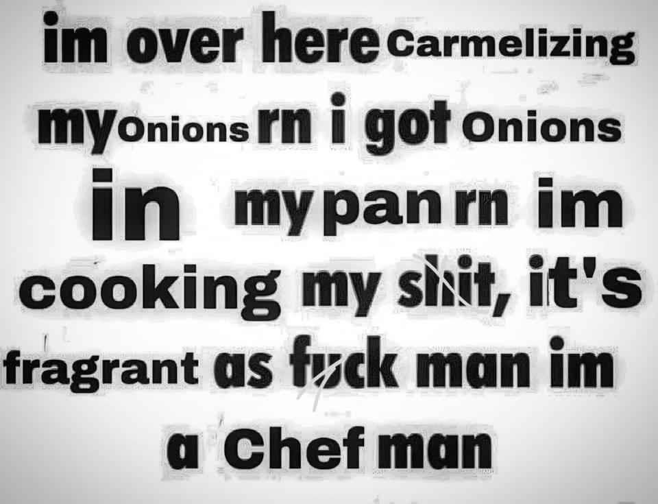 me by PUCKTHISFUTIN 5 Comments vlada_s_ 12 months ago Haha, I just finished eating my grilled cheese sandwich with caramalized onions. This is so true 😃 tkneezer 12 months ago I appreciate the weekly repost and also that imagine two onions meme props for keeping this sub funky fresh 😁👌🏽 SKULL_SHAPE_ANALYZER 12 months ago Good thing you crossed out fuck and shit, this meme could have been really offensive TeuthidTheSquid 12 months ago It really does make you feel like a chef.Everyone in the house: “What are you cooking? It smells so good!”Meanwhile all I’ve done so far is toss some onions in a pan to caramelize. I’m not even on step 2 of the recipe yet. Screwdriving_Hammer 12 months ago This mf spittin’.Write A CommentYou must be logged in to post a comment.