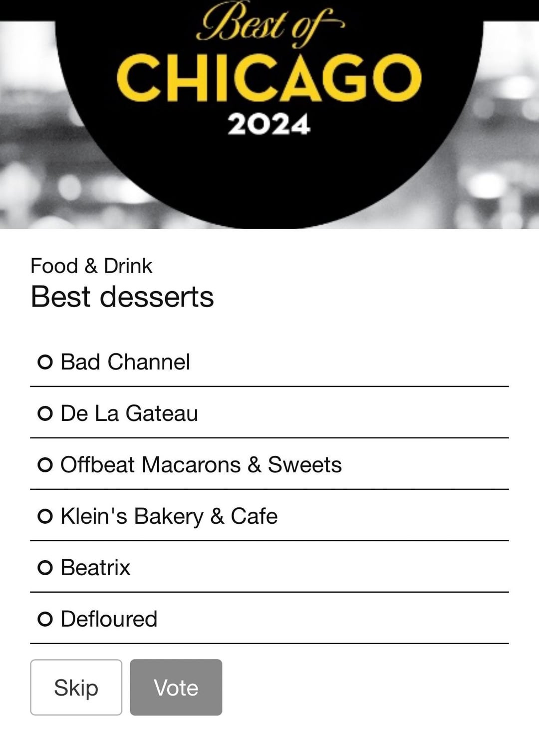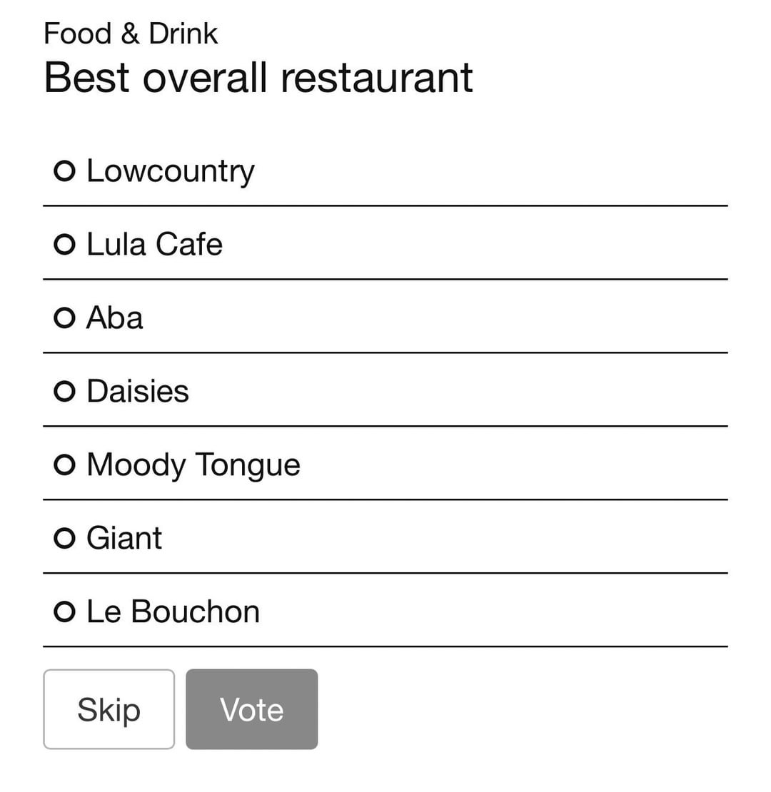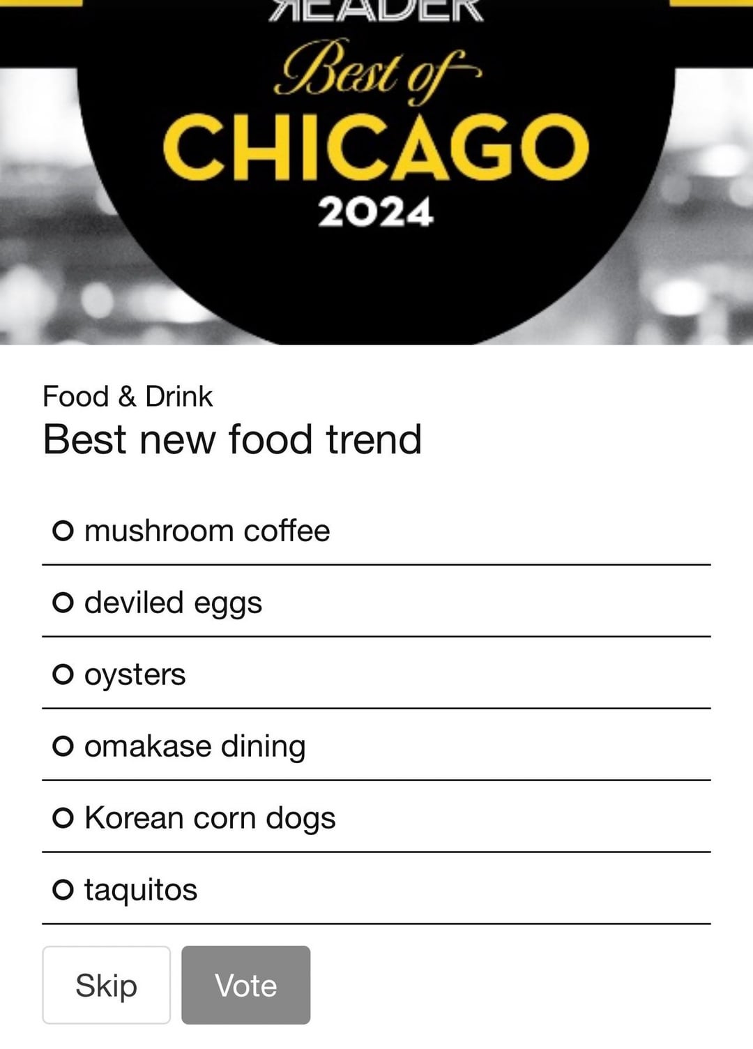 Some of my favorites from this year’s Best Of survey. The ability to pay for sponsorship/ad packages has completely ruined most of the categories (you’ll notice certain names pop up repeatedly), but that still doesn’t justify the trends question. I skipped most of the votes out of principle.