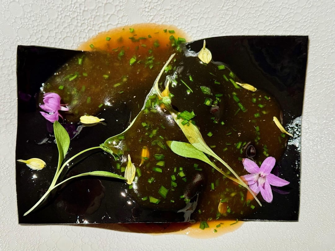 2. Sauid Ink Noodle over Langoustine and Abalone with Oyster Sauce – when this course came out it almost looked like a painting with the flowers and plants over the squid ink Taiwanese noodle. The oyster sauce was then poured over the squid ink noodle. While it looked visually stunning, the taste was just OK. The squid ink noodle didn’t work with the langoustine and abalone. Still a fun dish!