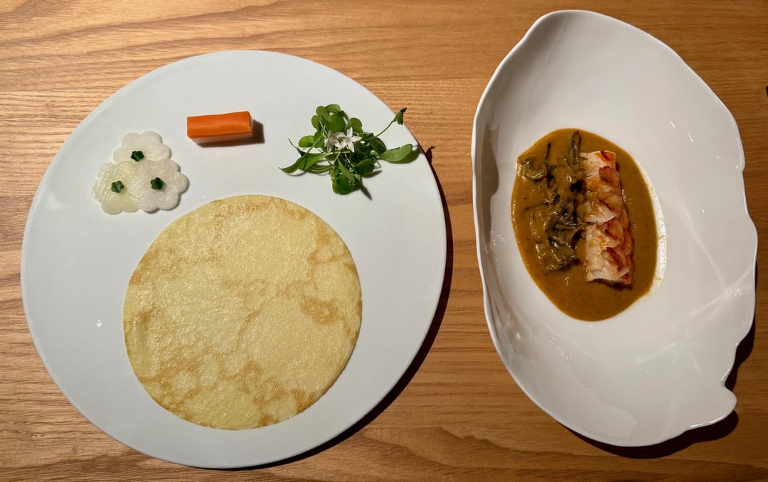 8. Maine Lobster with Banana Blossom and Fermented Banana Curry – time to assemble and plate your own food over the pancake. Another great dish.