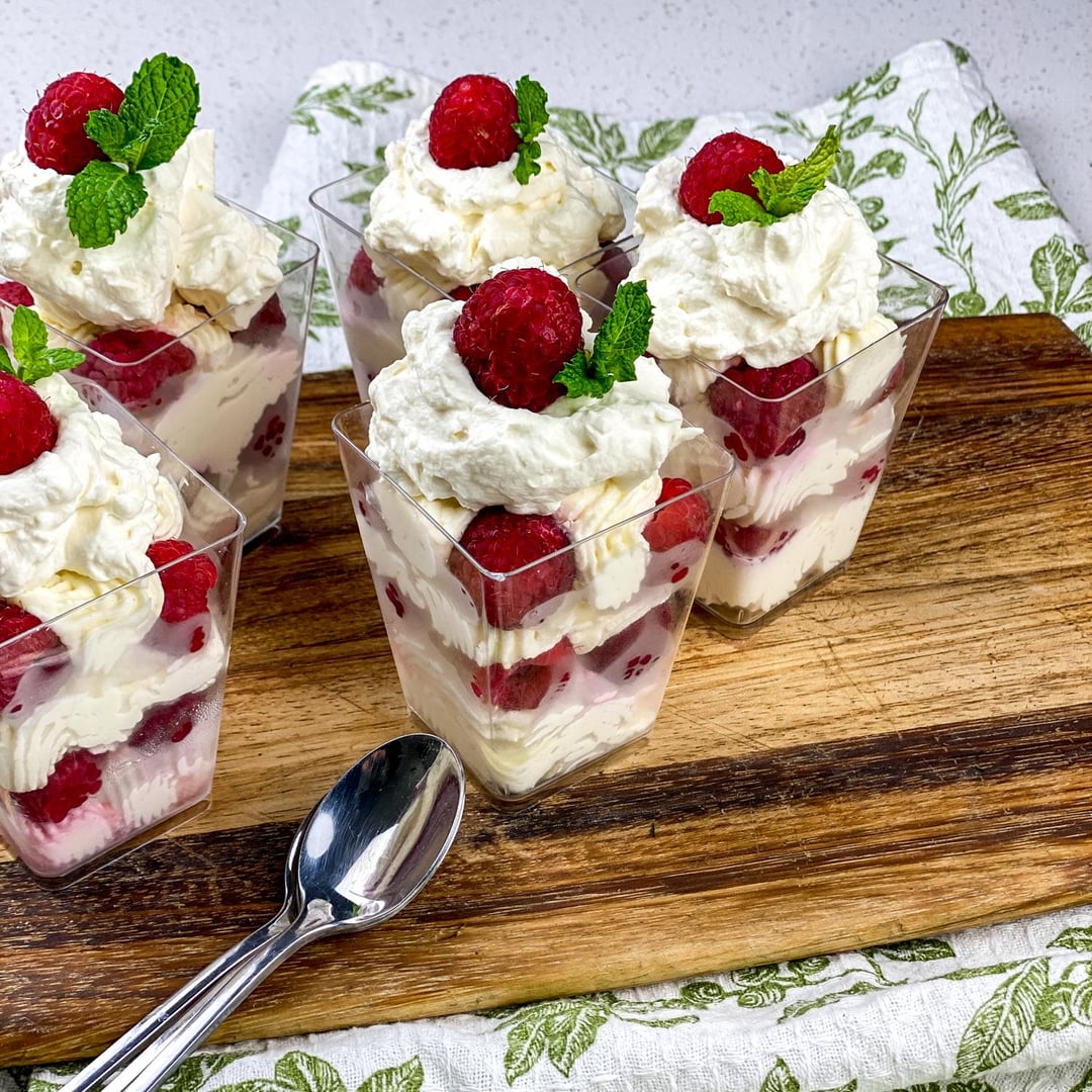 Remove the dessert cups from the refrigerator and top each with a dollop of fresh whipped cream. Garnish with an extra raspberry and a sprig of fresh mint, if desired, and serve immediately. Enjoy!