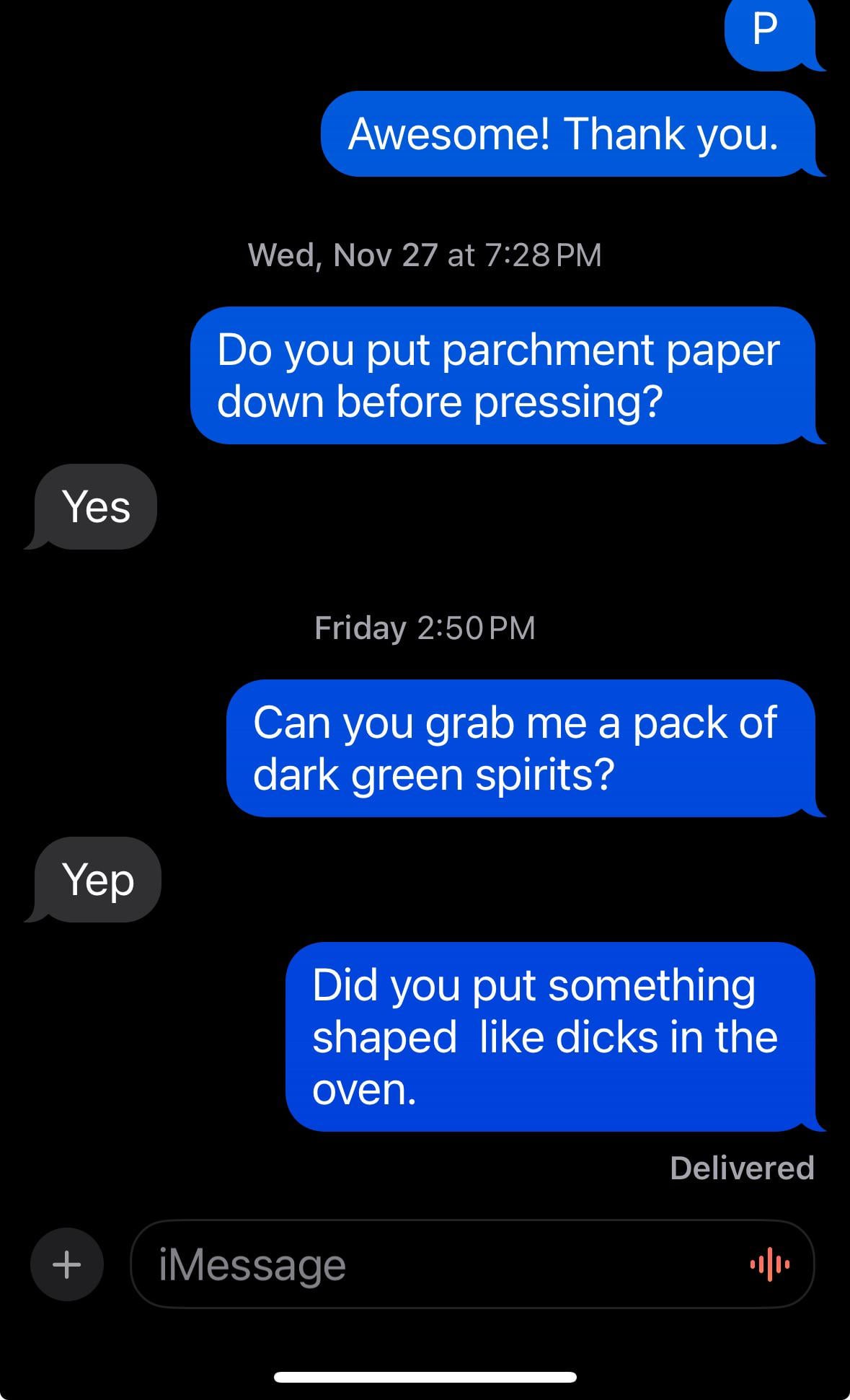 I’m the chef, please take my dick out of the oven and put it in the walk-in for me. Also I smoked three of your dark green spirits