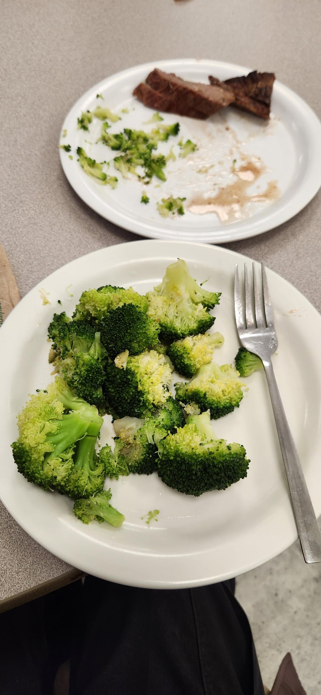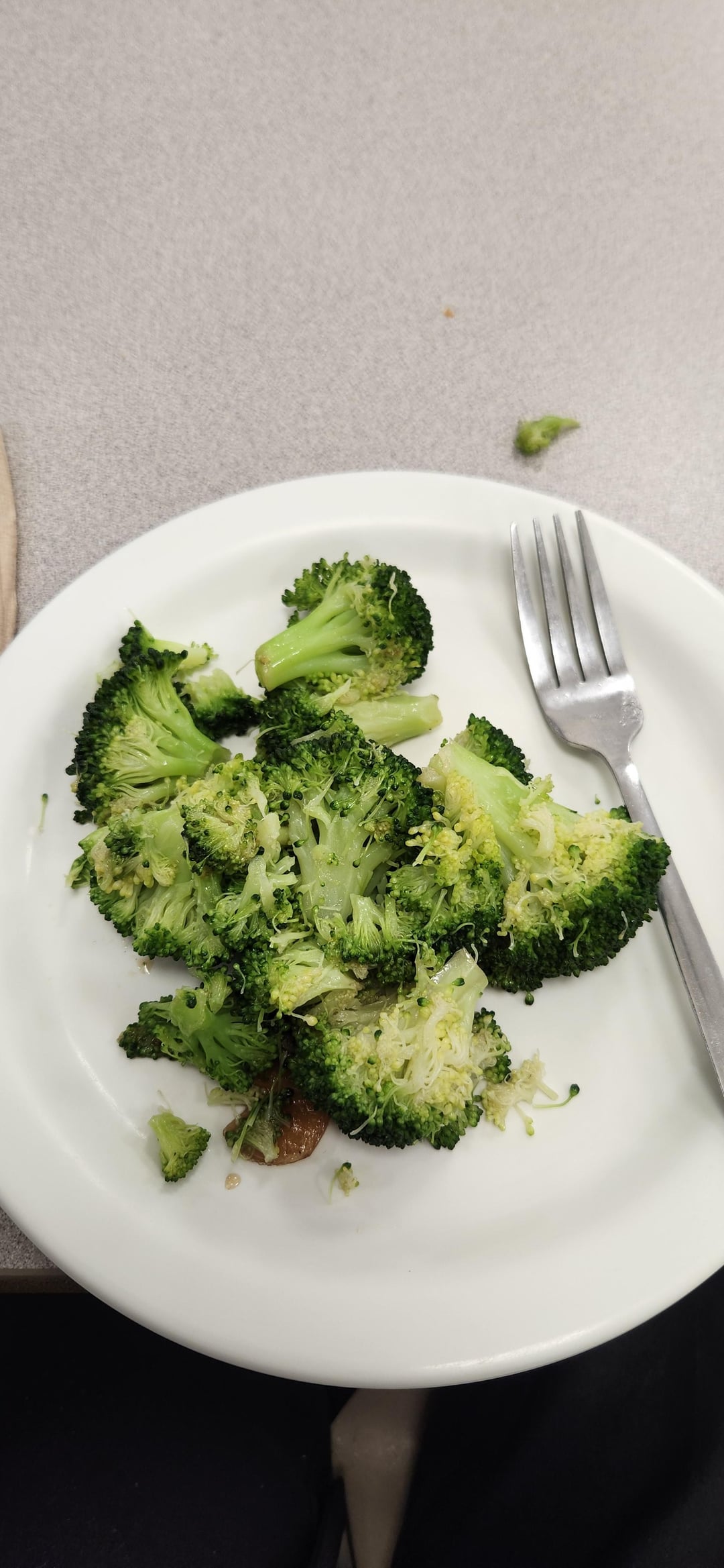 3 plates of steamed broccoli, some beef, and 2 apples (2nd apple not pictured but it was of similar size). Broccoli didn't seem to have any kind of garlic or butter or anything, just cooked. My guess was like ~500-550 for all of it? Is that too optimistic?