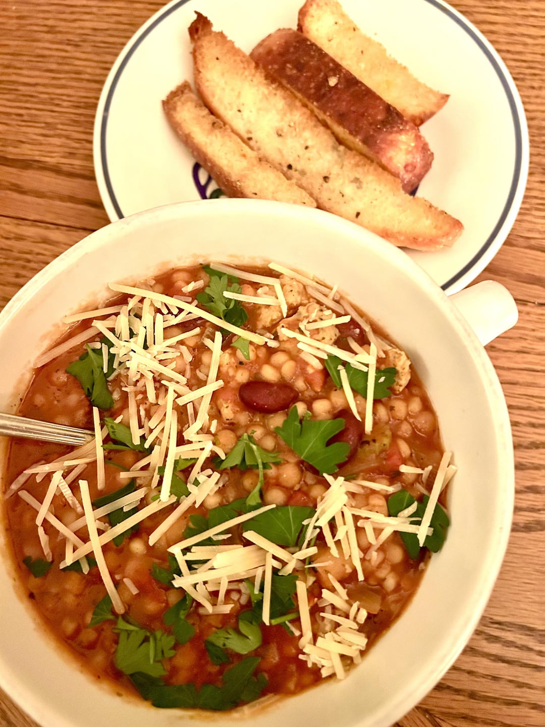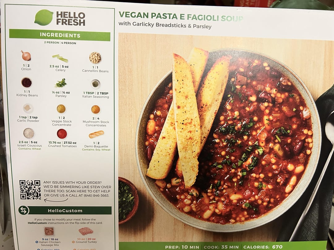 This is always one of our favorite soups from HF. We got the added chicken sausage but it’s also excellent without it. I extend the HF soups so we have extra leftovers with some to freeze. As always, I also add more garlic and seasonings and topped it with Parmesan. Delicious and filling on a cold night!