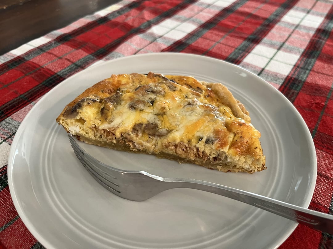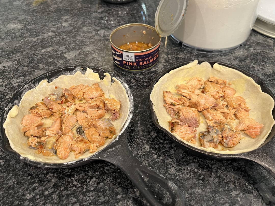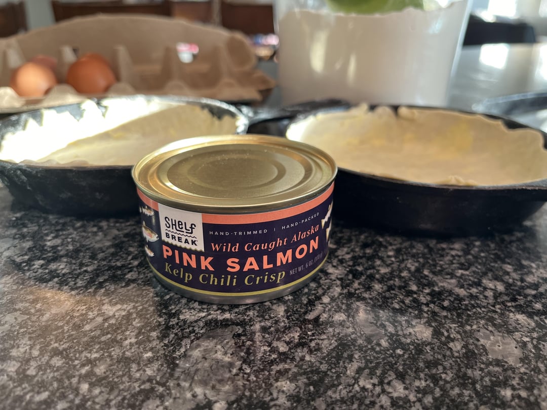 Breakfast Quiche made with Shelf Break Pink Salmon Kelp Chili Crisp along with some mushrooms, all topped with a bit of cheese. This was such a delicious Friday morning breakfast! We had some leftover pastry crust from last week’s Thanksgiving pie-making, so we decided to have some Kelp Chili Crisp Salmon in a breakfast quiche. My wife is the baker, so I was the chef’s assistant on this one (normally I do most of the cooking).