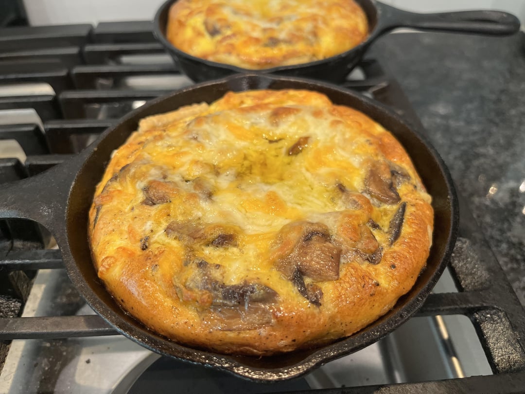 – Beat 4 eggs with some milk, salt, and pepper & pour into skillet (covering mushrooms & salmon)– Bake at 425°F for 10 mins