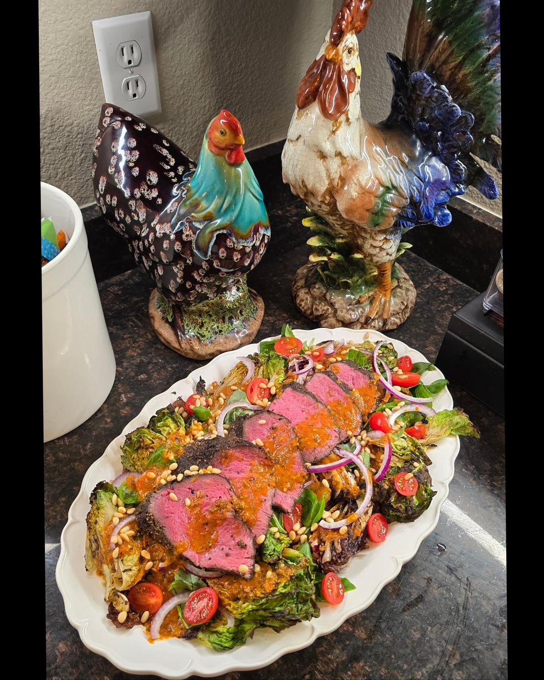 That looks delicious, I do have one question tho. Where you get the chicken statues from? Lol