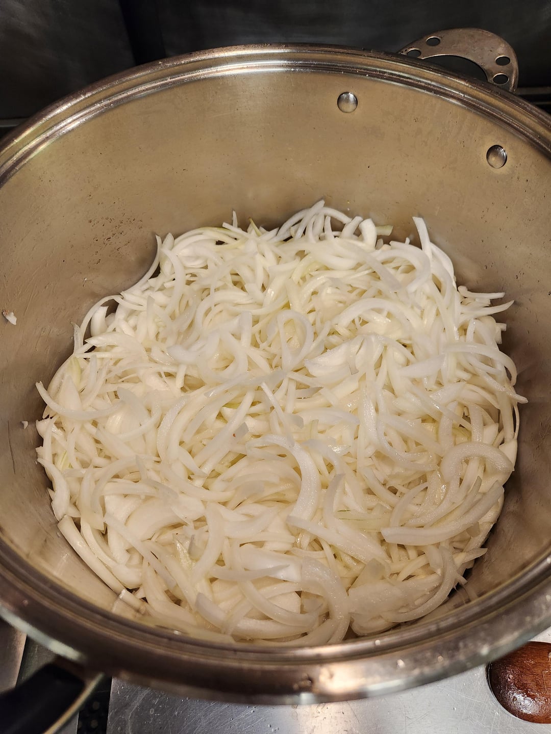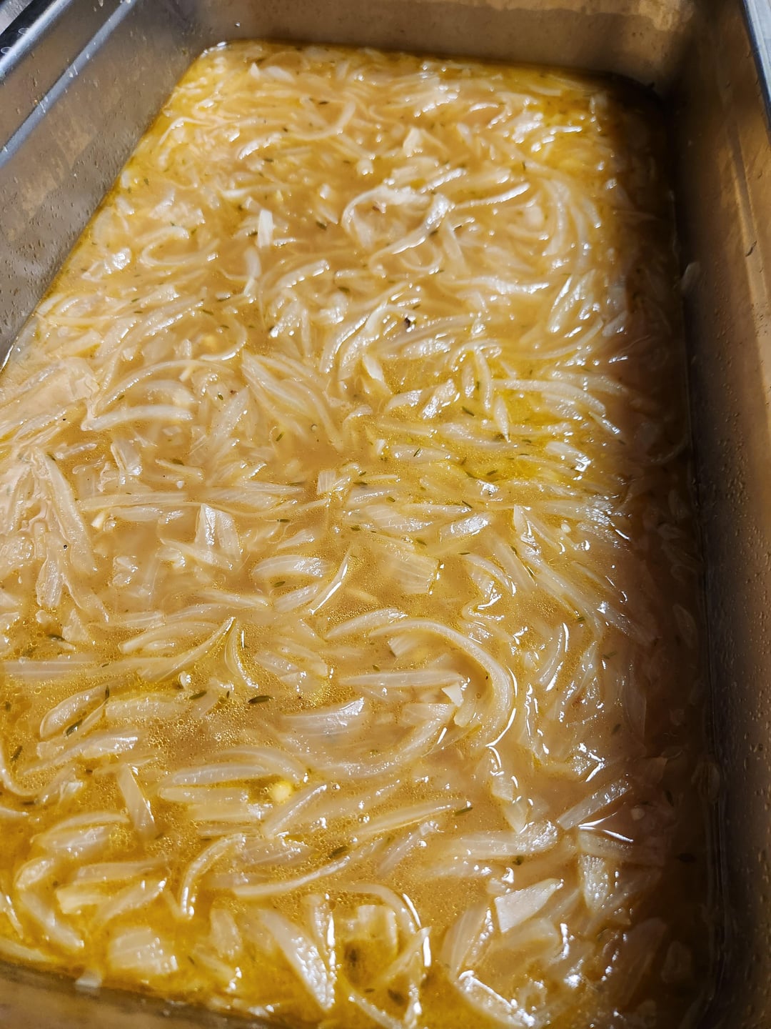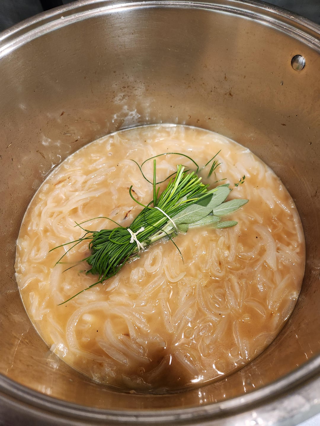 Very simple: Onions, beef broth (with more onions), sherry vinegar, bouquet of sage thyme and chives.