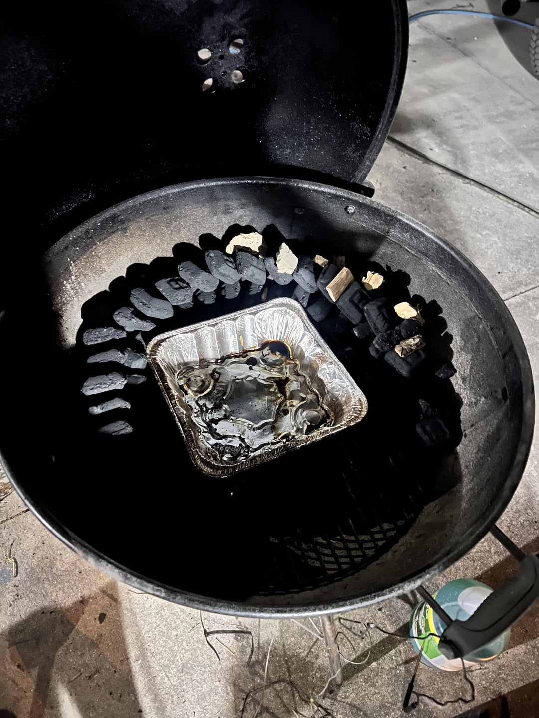 B&b snake on the 26" kept it going for 10.5 hours. Had to build another snake in my 22" ltd to finish the cook. Used a water pan in the 26 which caused the fuel to be consumed faster. Ghetto deflector in the 26