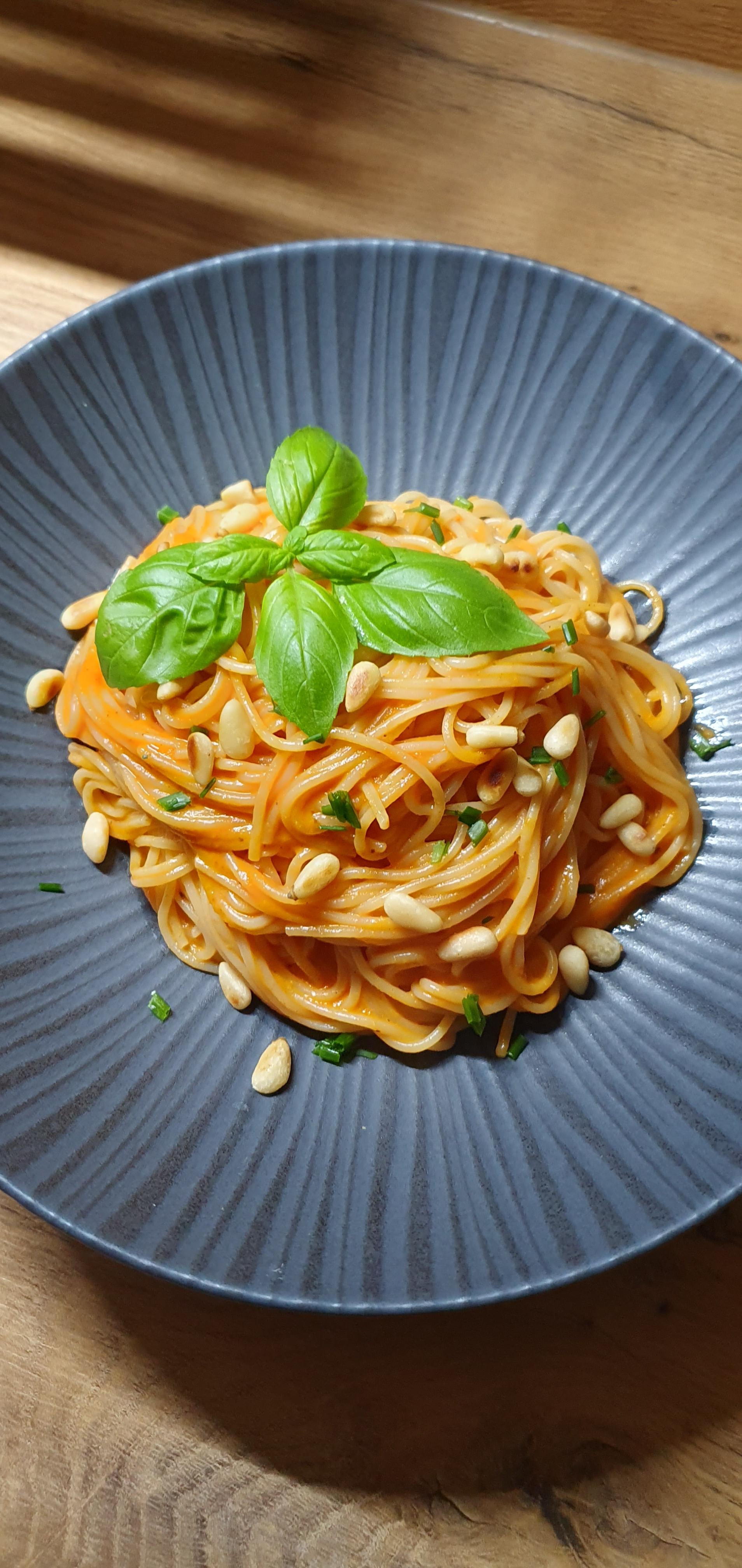 As soon as the penne is cooked, drain (collect the pasta cooking water!), drain and mix with the sauce. If necessary, add a little pasta cooking water if it is not "saucey" enough. Gently roast the pine nuts in a pan.