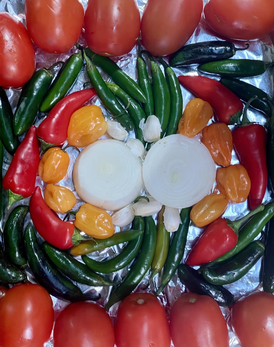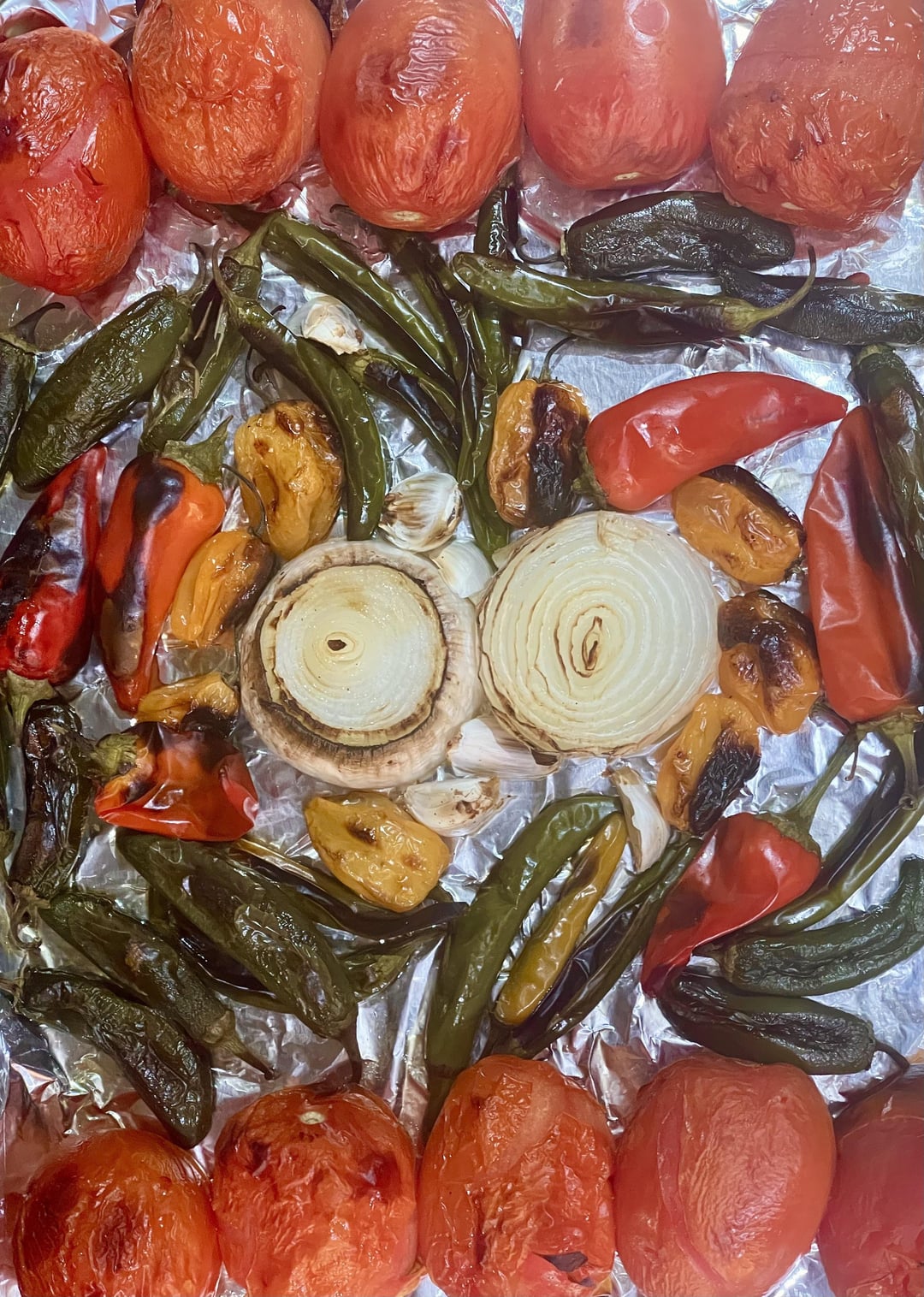 I decided to go spicy 12 jalepeno 14 Serrano chilis 6 Fresno red pepper 8 Habanero’s 1 white onion 10 Roma cloves 6 clove garlic 1 bunch Cilenteo 1 tsp cumin 2 limes squeezed Salt and pepper Roasted in oven 10 min Flipped and roasted 8 more