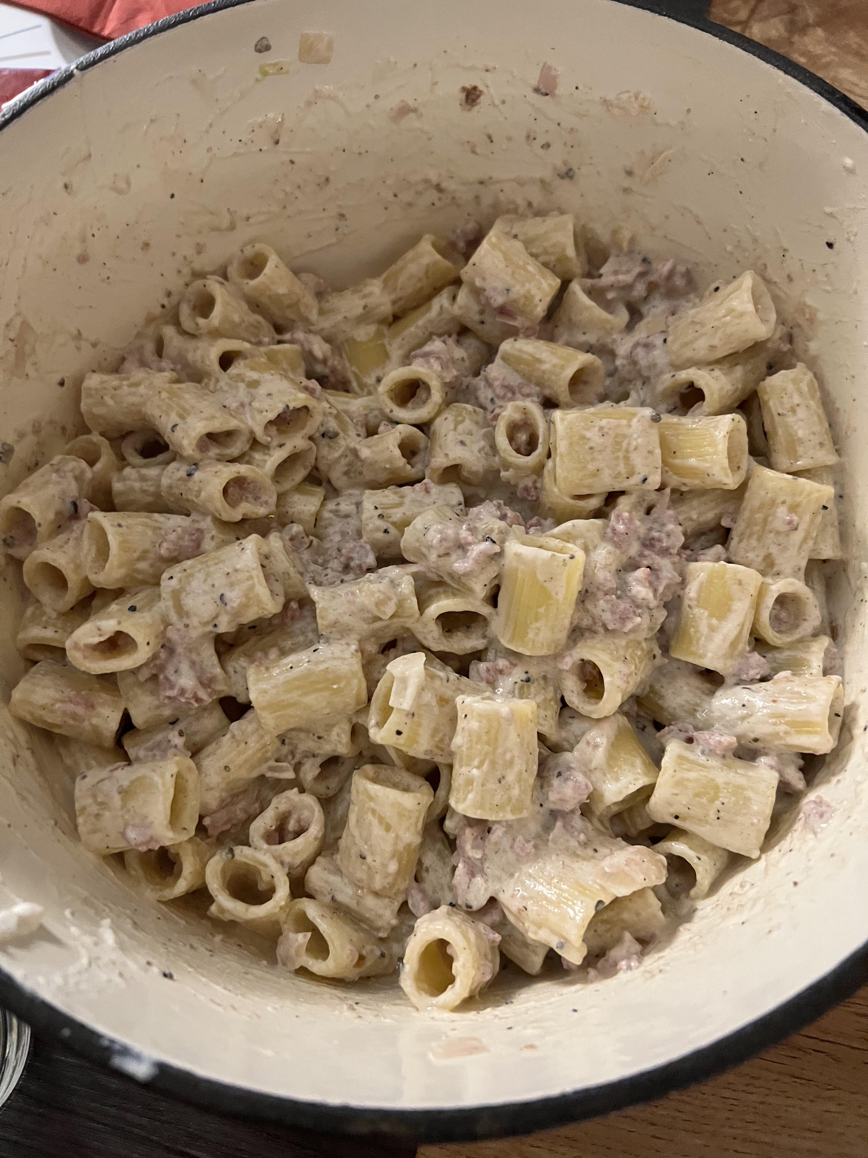 Made Norcina tonight for my guests. 400g of Mezze Maniche. 300g of truffled Salsicca. 250 of sheep’s Ricotta. 100g of of Pecorino Romano. 30g of black truffle. 1 onion. 3 cloves of garlic. Salt and Pepper. Turned out quite tasty.