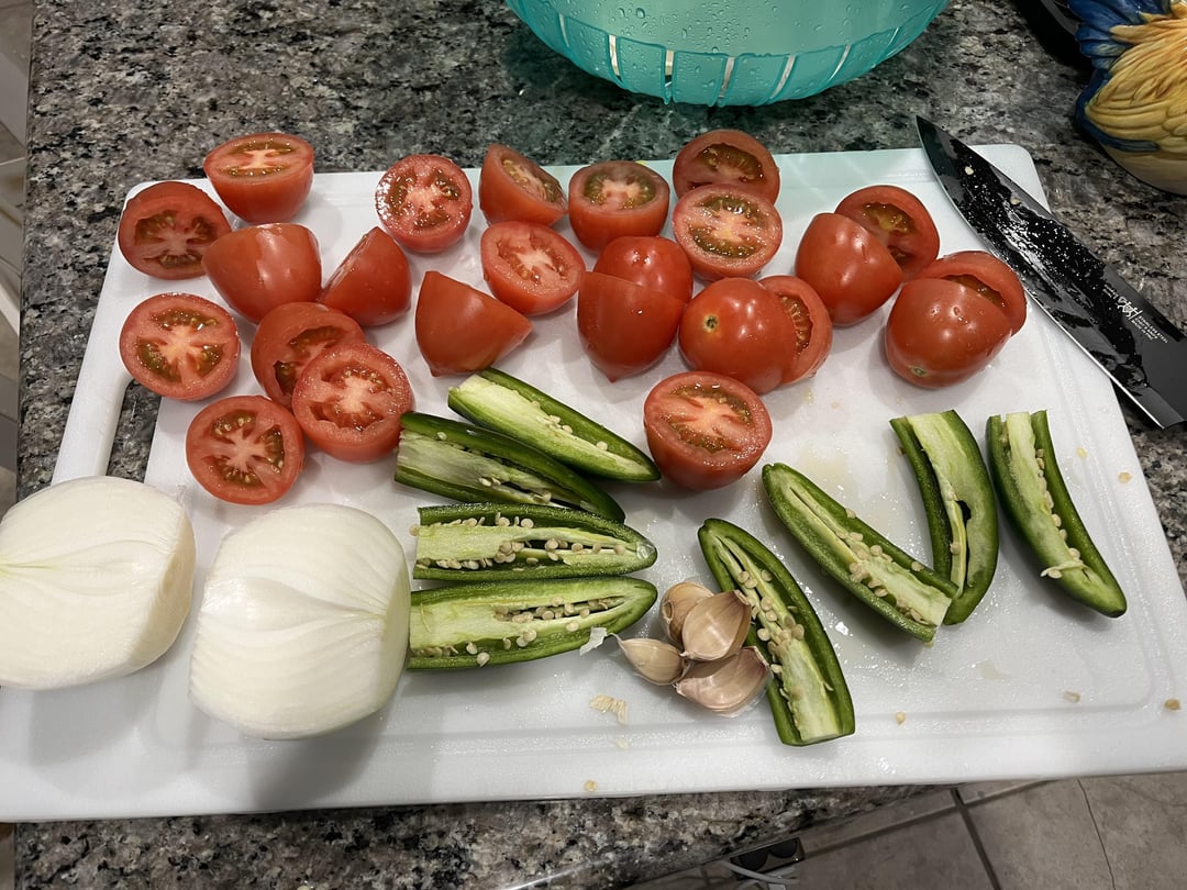 12 roma tomatoes, 4 jalapeno, a whole white onion, 3 garlic cloves, cilantro and lime juice. salt and pepper