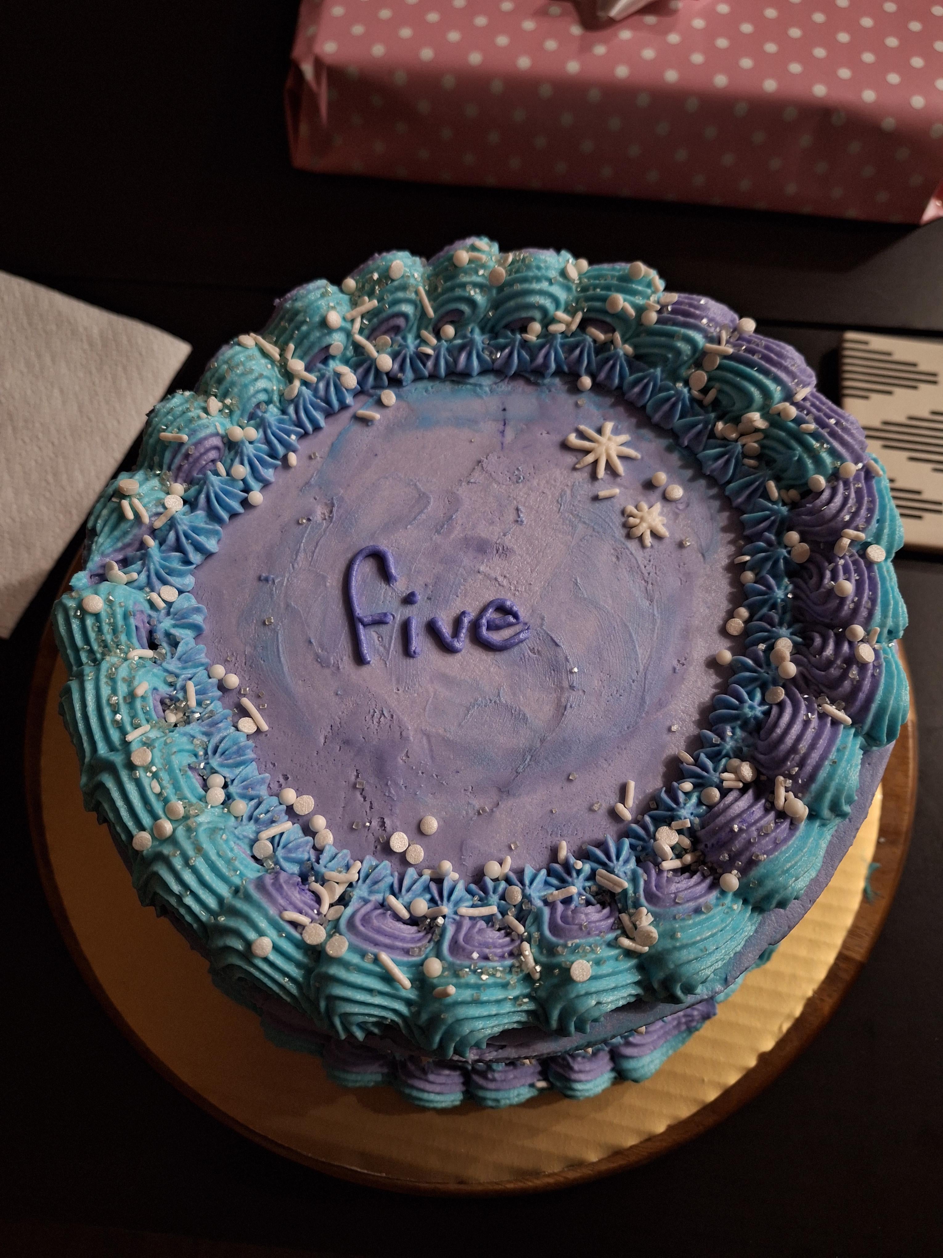 Just having the word “five” is a bit odd to me. I would have done just a big number 5 instead. Very nice looking cake otherwise. I would be thrilled to get this for my birthday.
