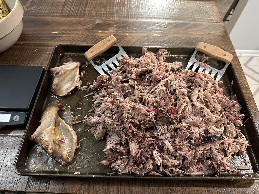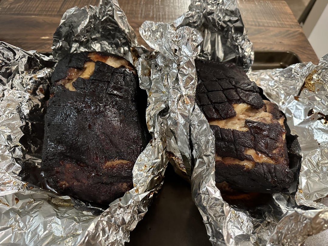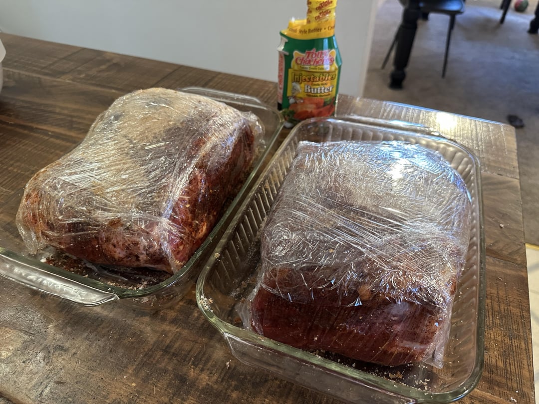 Put on at 8:40am, 2 smoke tubes, wrapped at 165, let rest for 2 hours once they hit 203. Pulled and bagged at 7pm. Wow those samples were good! Ready for the crock pot Xmas day.