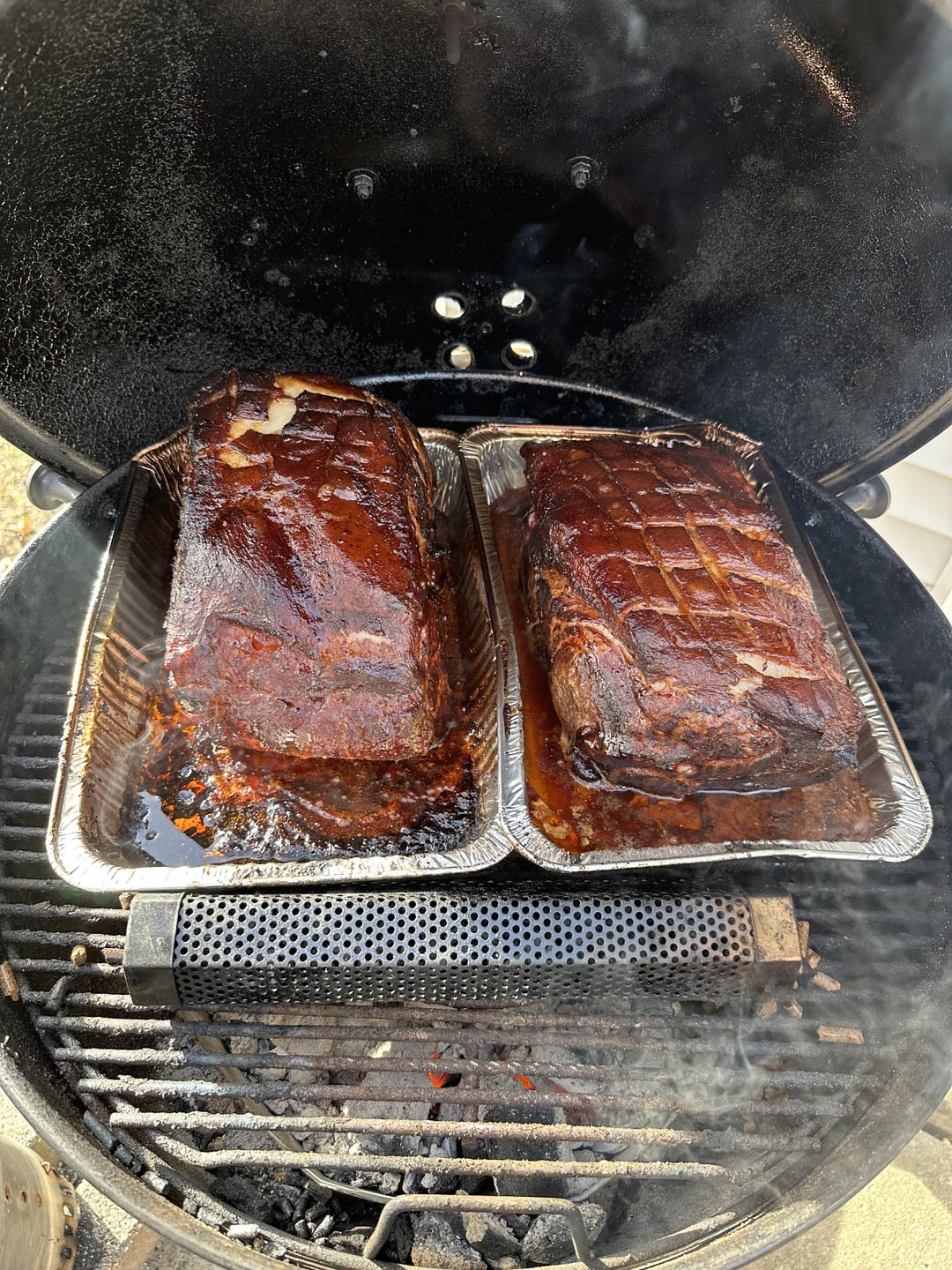 Seasoned and wrapped overnight then injected with creole butter before putting them on. Blues Hogs, cracked salt & pepper, sugar, brown sugar. Butter & orange juice in the tin. Fat down for an hour then fat up for the long haul. Rotated once.