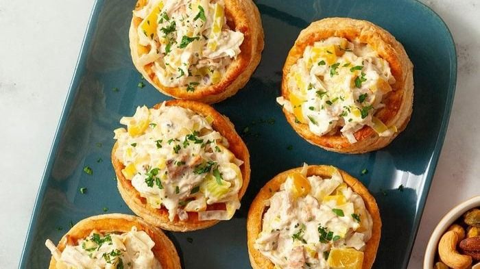 Vol Au vent is easy Christmas appetizer recipe uses frozen puff pastry and store-bought rotisserie chicken, resulting in a 40-minute assembly and baking time.