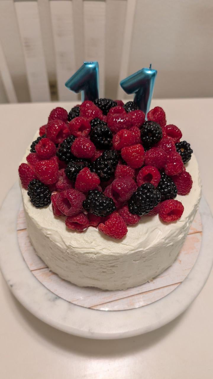 For my stepdaughter's 11th birthday, I made a vanilla Castella cake, filled with fresh raspberries and blackberries that I coated with raspberry syrup and layered with more whipped cream. I piled so many berries on top that there was almost no room for the candles lol.