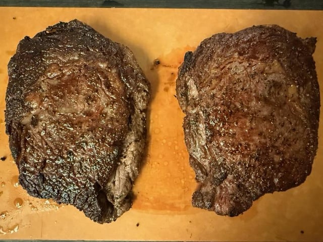 I’m not trying to be critical, but I’m going to go out on a limb and guess you seared the one to the left first. When you add food to a pan, that can rapidly reduce the cooking temp of the surface area. Hence the guess why the sear on that one looks a lot better.