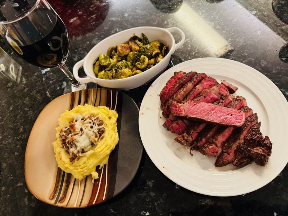 The sides are roasted brussel sprouts tossed with thai chili sauce, and a little basalmic glaze, and mashed potatoes filled with ground beef that i cooked with shallots, tomato paste, and garlic paste, then topped with mozzarella and broiled for a minute to get it brown.