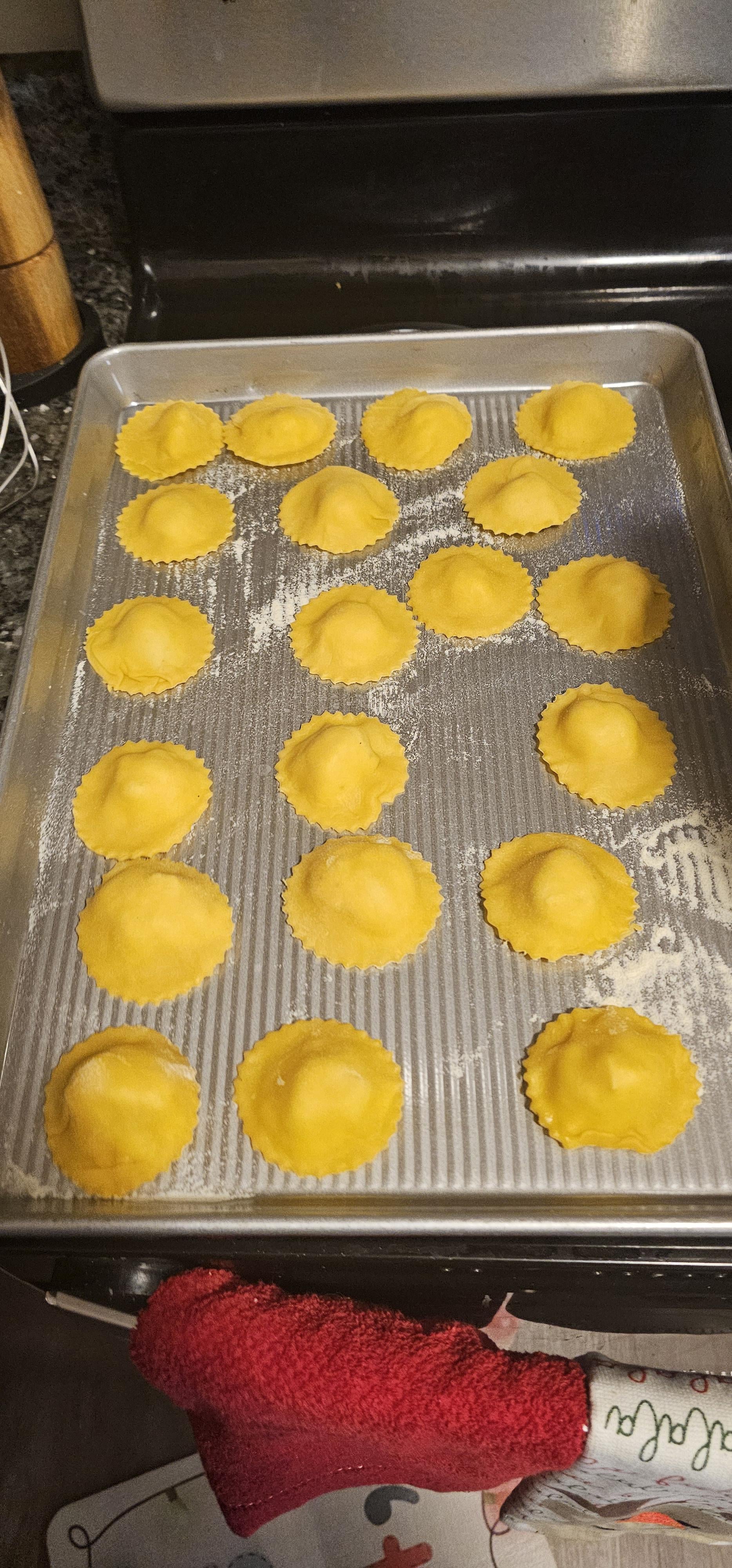 My first attempt at making Raviolis. I choose to utilize Helen Rennie, and Brian Lagerstrom's recipes and videos for guidance. Sheeted pasta to a 6 on my Kitchen aid roller, egg wash to seal. Filling is Ricotta, Mozz and parm with an egg for the binder.