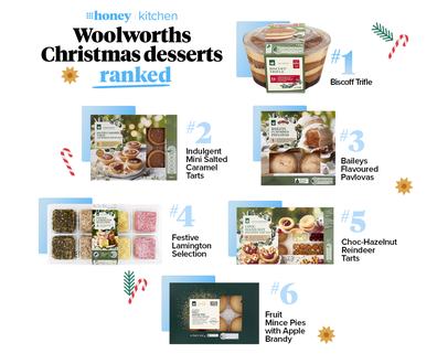 9honey Kitchen’s very official Woolworths Christmas dessert rankingWoolworths Biscoff Trifle – $35Woolworths Indulgent Mini Salted Caramel Tarts – $8 for six packWoolworths Baileys Flavoured Pavlovas – $8 for a four packFestive Lamington Selection – $16 for an eight packWoolworths Choc-Hazelnut Reindeer Tarts – $17 for a nine packGold Fruit Mince Pies with Apple Brandy – $10 for a six pack