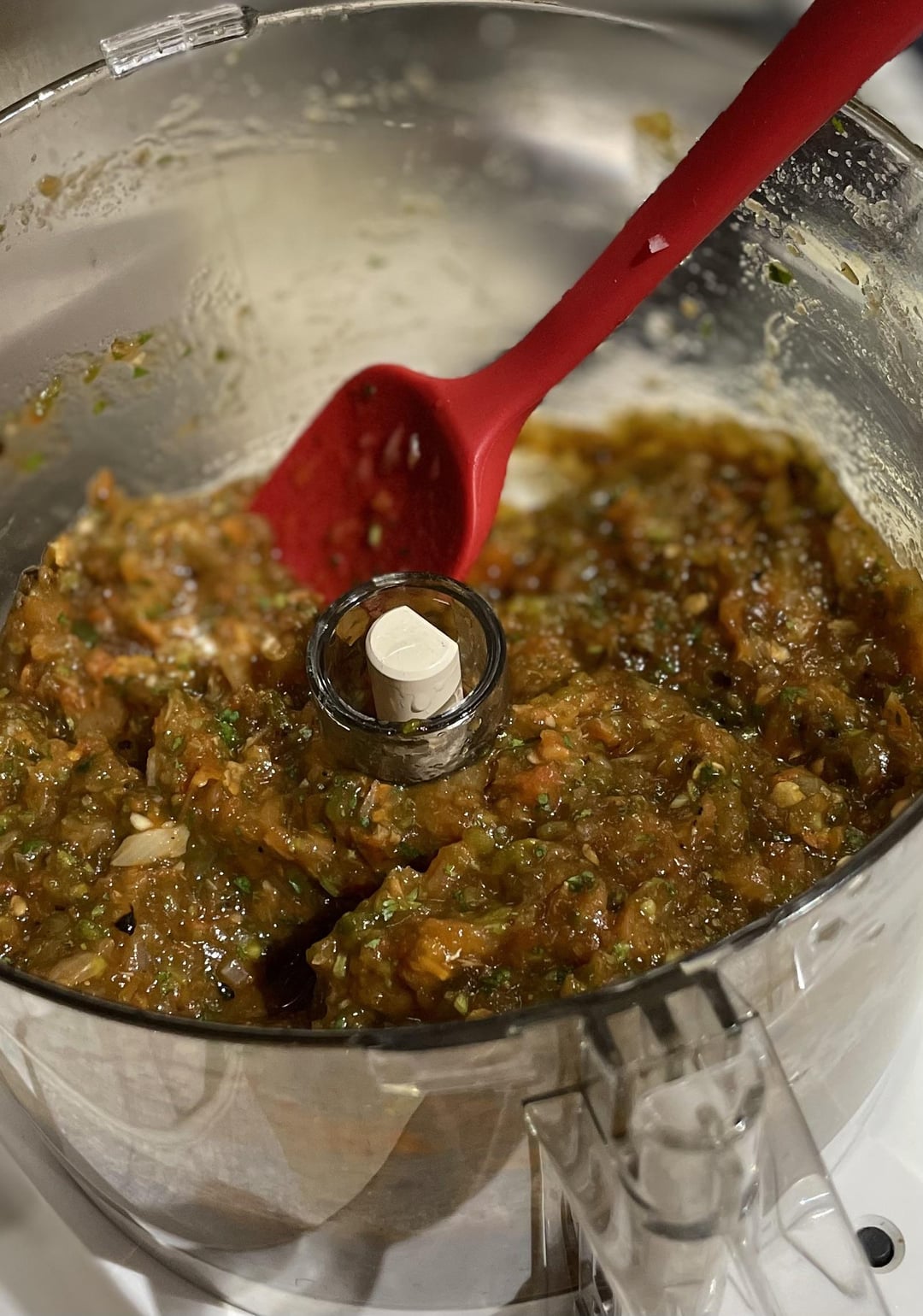 broiled the veg except cilantro for about 15 minutes then pulsed in food processor with cilantro… tried to keep it chunkier than usual this time. squeezed in the juice from about 1/4 lime.