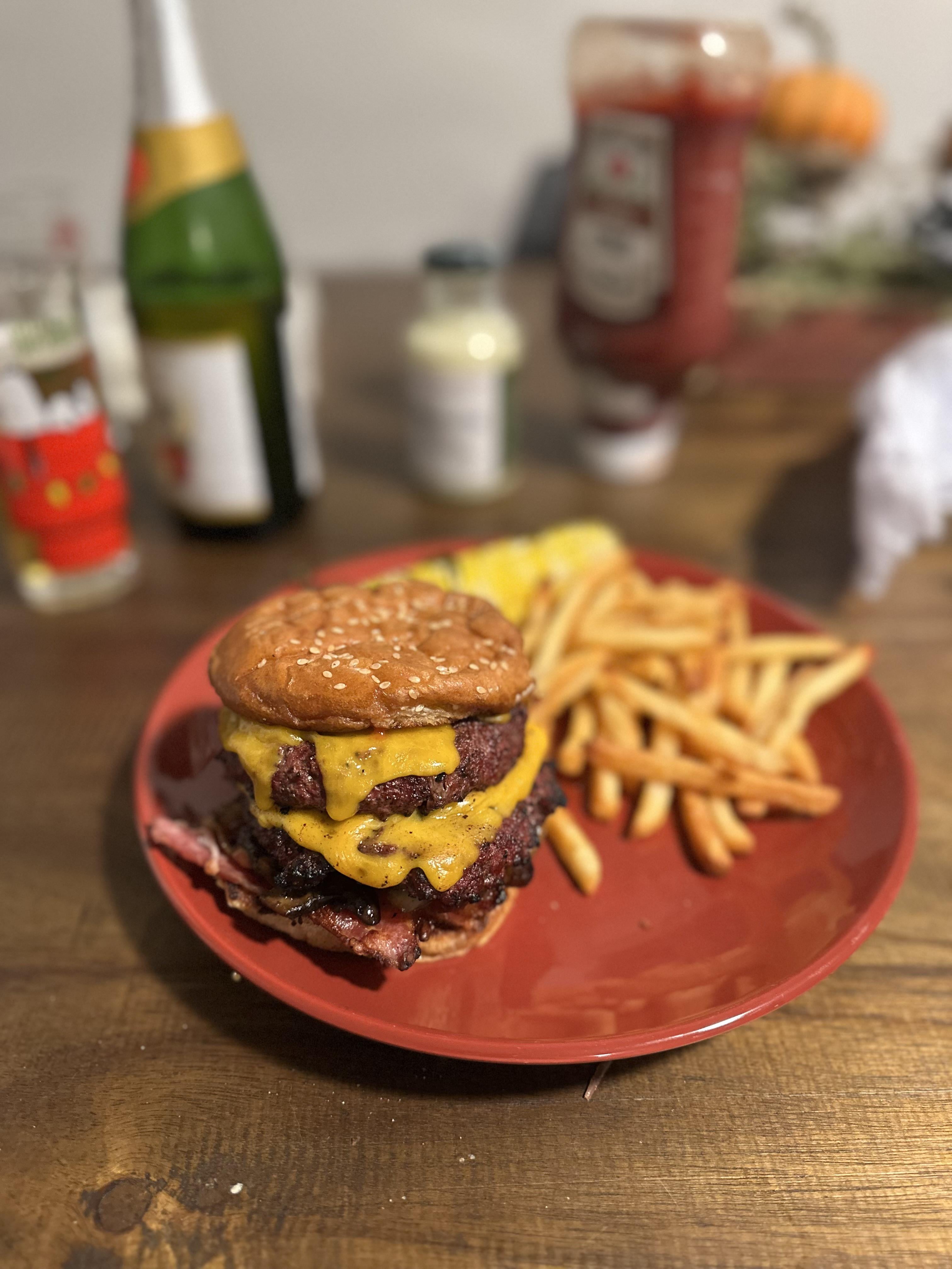 Office gave me half a cow as a gift. Used the ground to make some burgers. Did bacon, onions and mushrooms on the Weber kettle in my cast iron and smoked the patties before searing them off. Might be the best burger I’ve ever made.