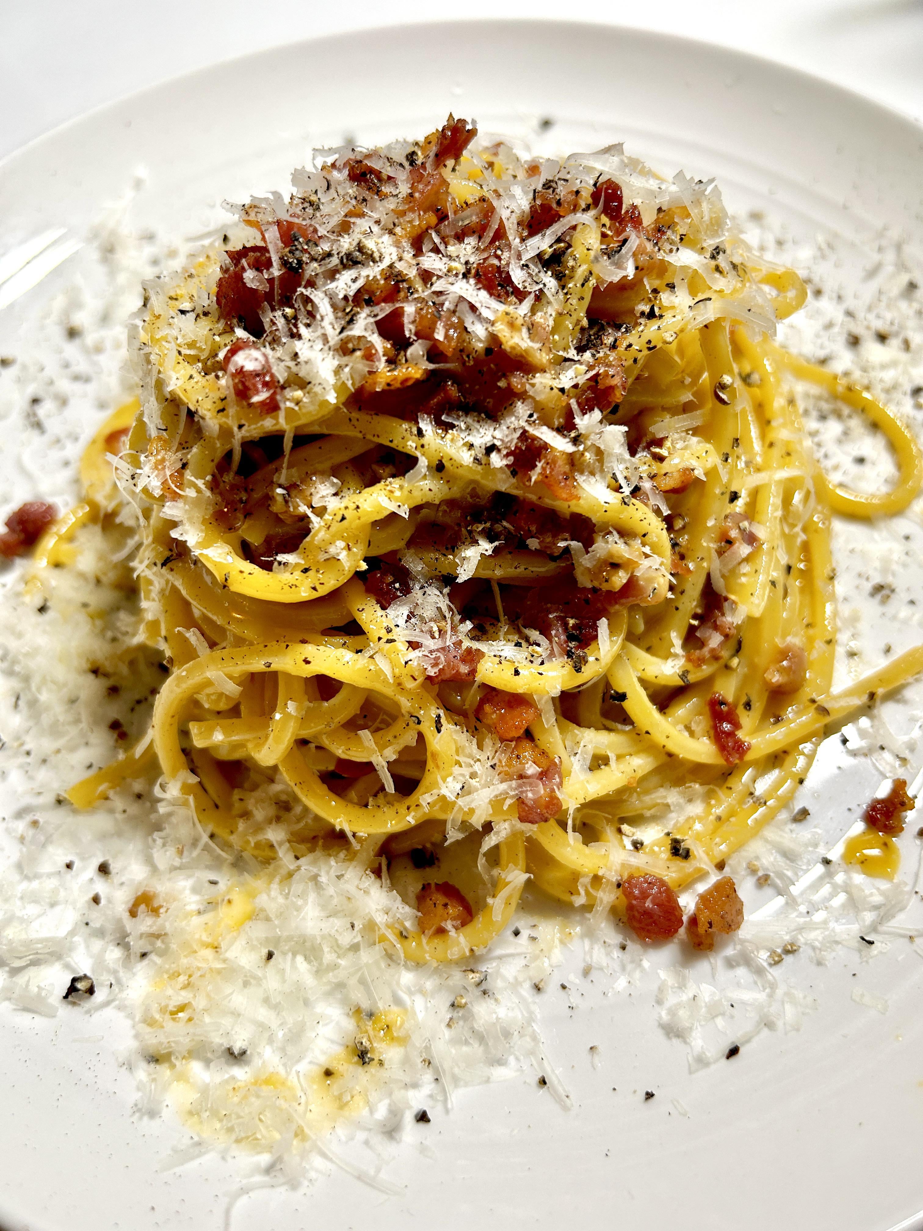 Used to think the “carbonara” we served at the restaurant I worked at was the best thing in life(😂)… until I found out it was the farthest thing from the original dish. 2017 was the first time I attempted it. In 2022, I saw how Chef Luciano Monosilio makes carbonara and it helped me refine the process. Only thing I don’t have easy access to is guanciale, so pancetta gets used
