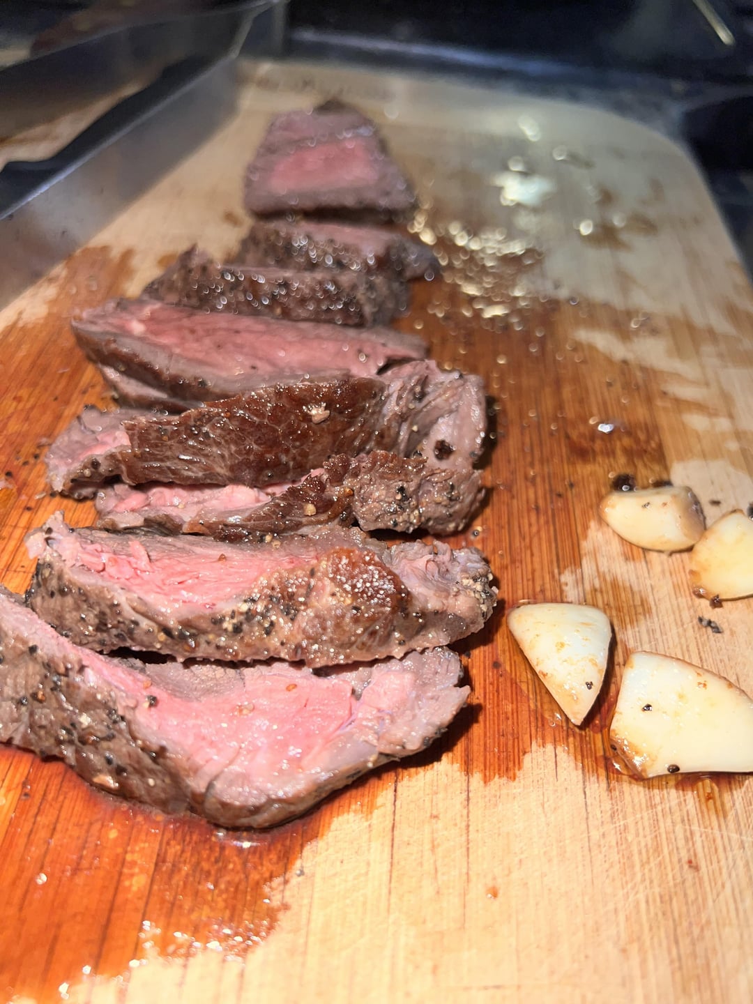 Not bad! I’d do another hour, and then make sure you get it nice and dry before searing. A combination of paper towel pat down and a few minutes on a wire rack in the fridge work great, but even if you just dry it really well on the cutting board it’ll be fine. Ghee might not be the best choice for a sear, you want something that can get nice and hot. I use avocado oil. That way, because it’s so hot, it doesn’t need to be in the pan for long.