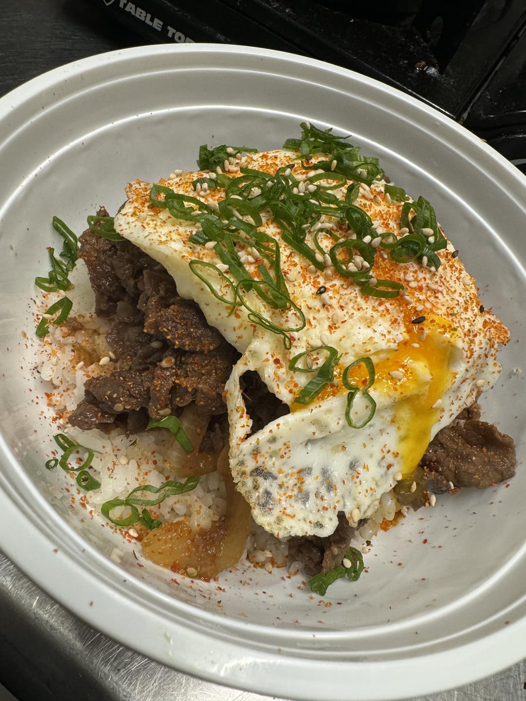 The beef bowl picture is old and it now gets winter radish kimchi as well (also loaded with green onions)