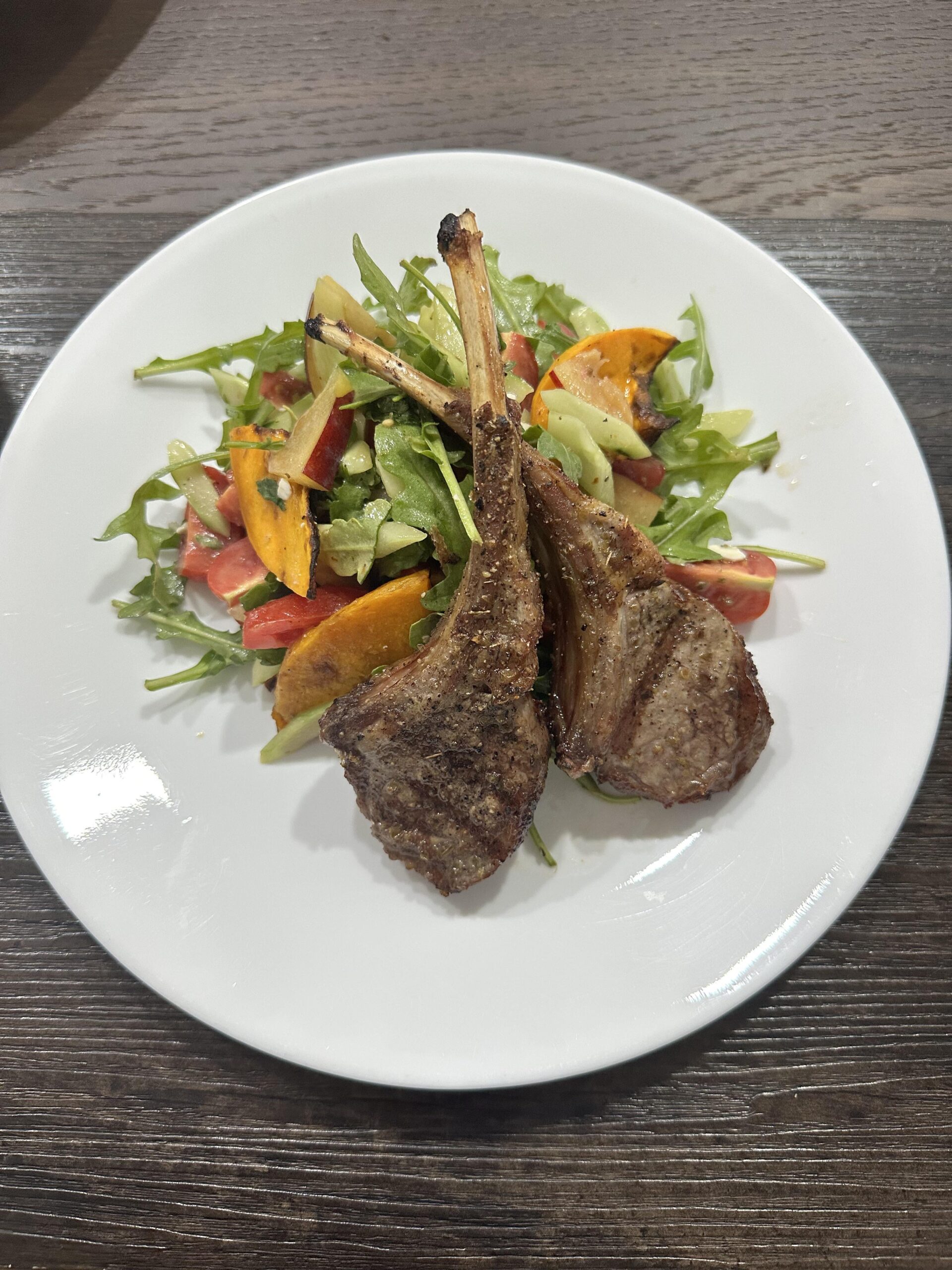 Grilled lamb chops with a salad that I randomly made up (rocket leaves, cherry tomatoes, cucumber, sliced plums, grilled pumpkin slices and some sheep’s feta). Dressed it with some Greek olive oil, red wine vinegar, yellow mustard.