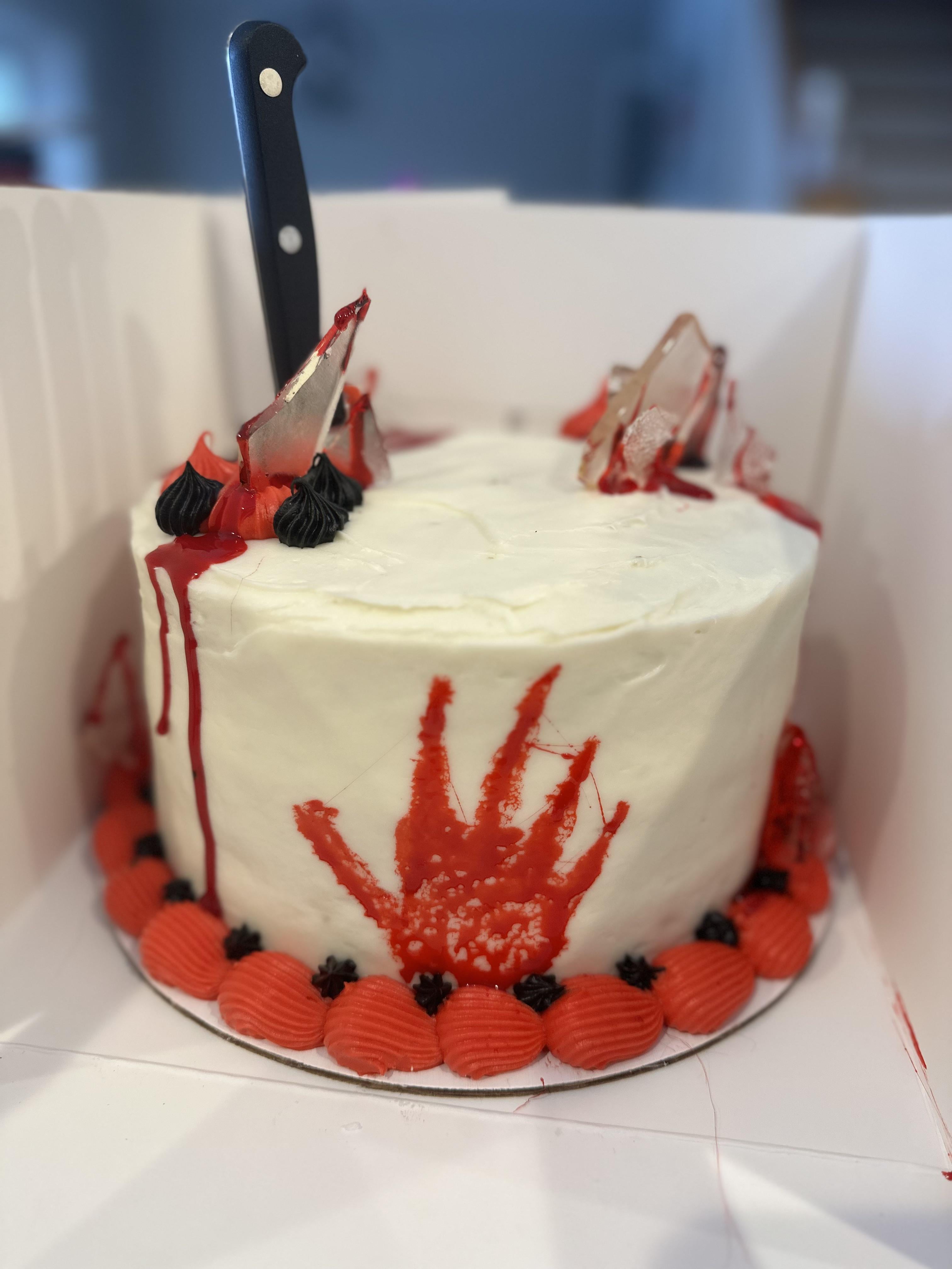 She requested a “horror” themed cake and specifically requested the bloody hand prints and dripping blood. Decided to add sugar glass shards to up the creepy factor.