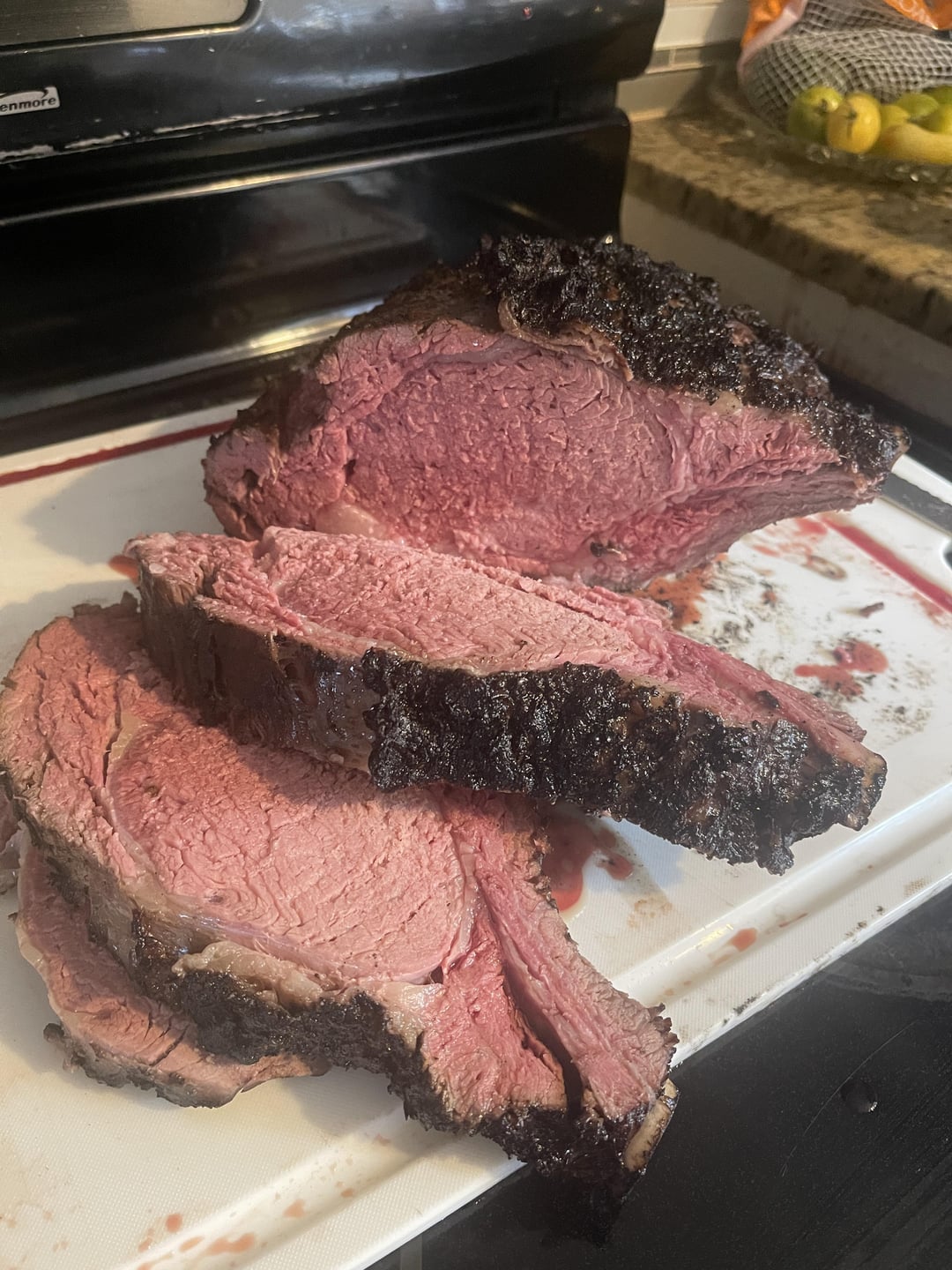 18 hours at 136 F, with a 4 minute per side reverse sear on the kettle bbq over grape cordon wood.