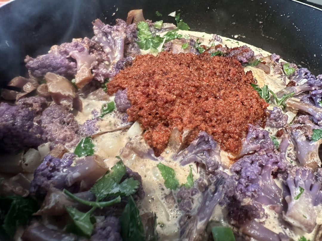 5)Check on the tenderness of your cauliflower (I needed to add just a splash of water so my cauliflower wouldn’t burn). Close the lid for about two minutes so it can continue to steam. Open the lid so any excess water evaporates while stirring. Turn the heat to low.